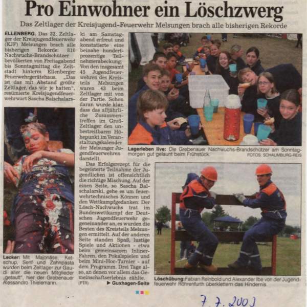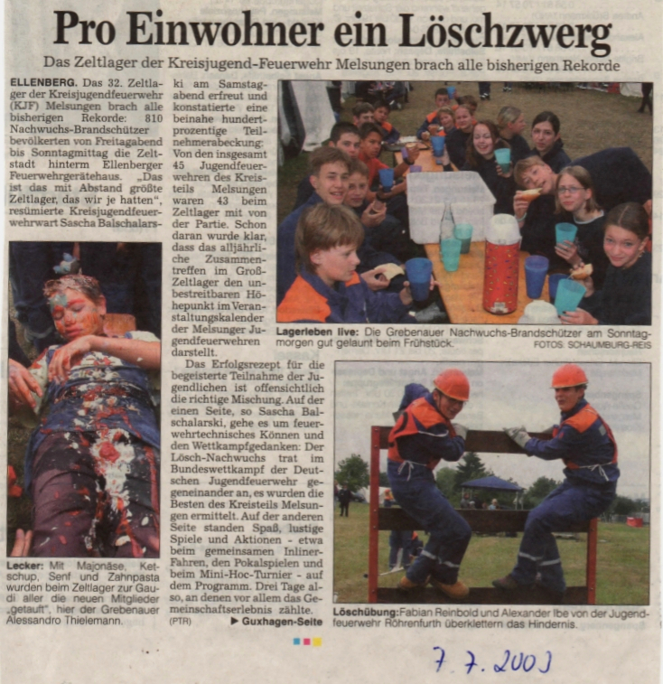 32. Zeltlager der Kreisjugend Feuerwehr in Ellenberg Zeitungsartikel HNA 07.07.2003