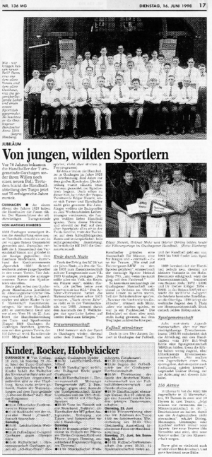 Im Rahmen der Feierlichkeiten zum 110-jährigen Bestehen des TUSPO-Guxhagen 1998 hat die HNA auch einen Bericht über die Handball Abteilung geschrieben, die auch 75 Jahre alt geworden ist.