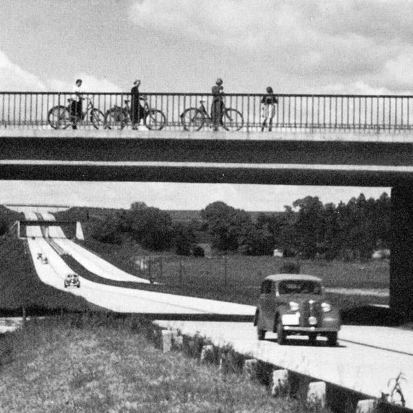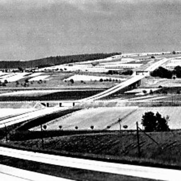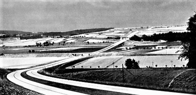 Vermessungsbeamte der Reichsautobahn erschienen, um einen Geländestreifen in einer Breite von 32 m mit Pfählen und Fähnchen abzustecken.