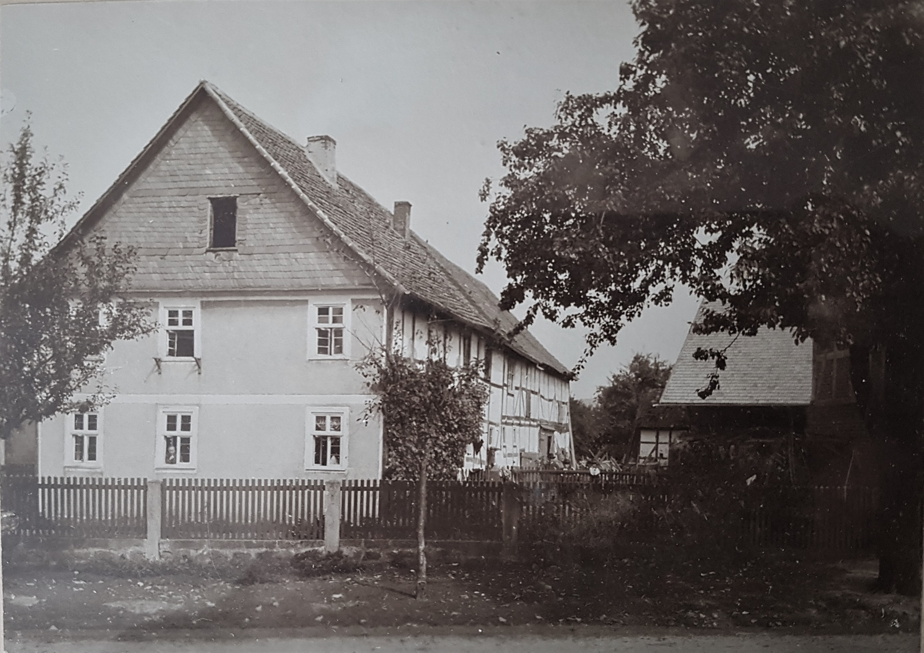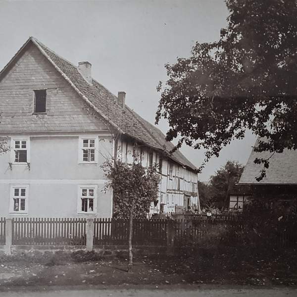 Das Bild zeigt Fritz Manns (Kind, Jg. 1905) und dessen Vater Johannes Manns. Sie stehen an der Einmündung des heutigen Heideweges direkt an der "Nürnberger-Straße". Die Gebäude im Hintergrund sind das Haus / Scheune Kördel, Stammsitz der Fa. Heinrich Kördel.