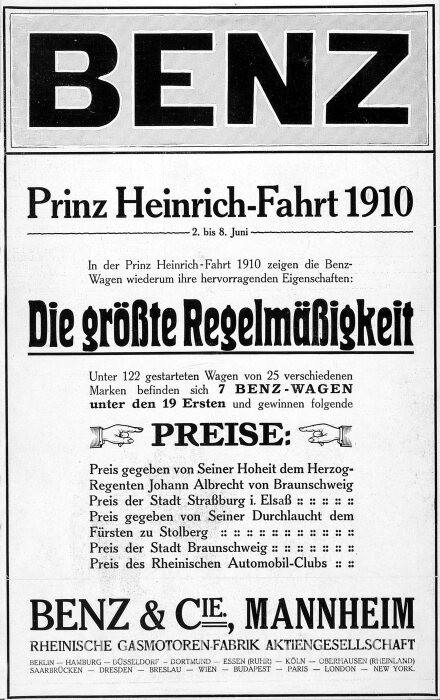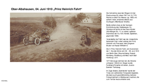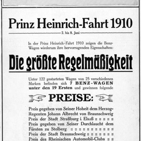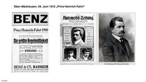 Die Prinz Heinrich Fahrt 1910 führte von Brauschweig über Kassel, Nürnberg bis nach Straßburg mit über 120 Fahrzeugen. Sieger wurde Ferdinand Porsche auf "Austro Daimler". Veranstalter war der Kaiserliche Automobil Club unter Prinz Heinrich von Preußen, der jüngere Bruder von Kaiser Wilhem II.