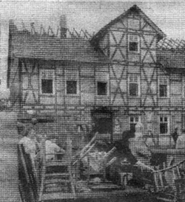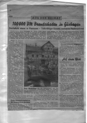 100.000 DM Brandschaden nach Dachstuhlbrand des Gast- und Lichtspielhauses Riedemann.
