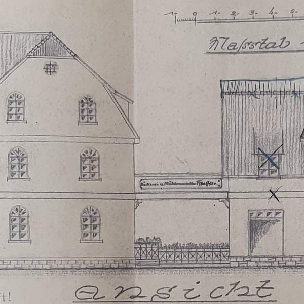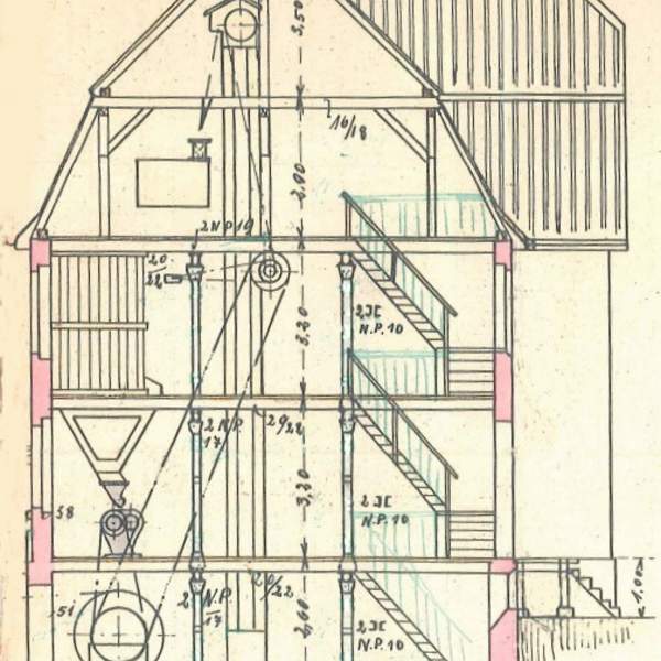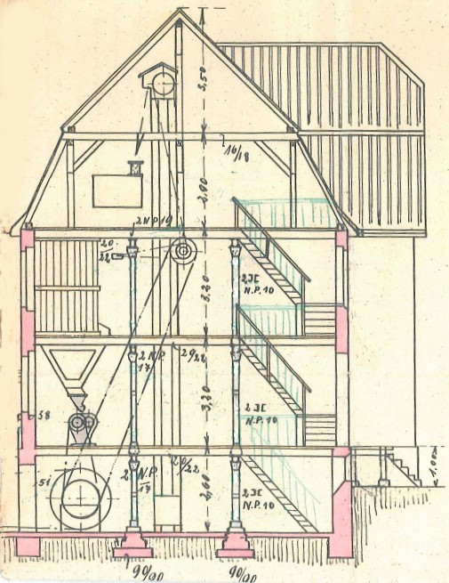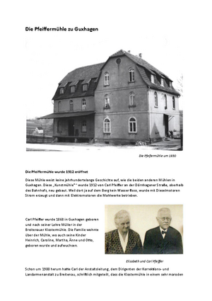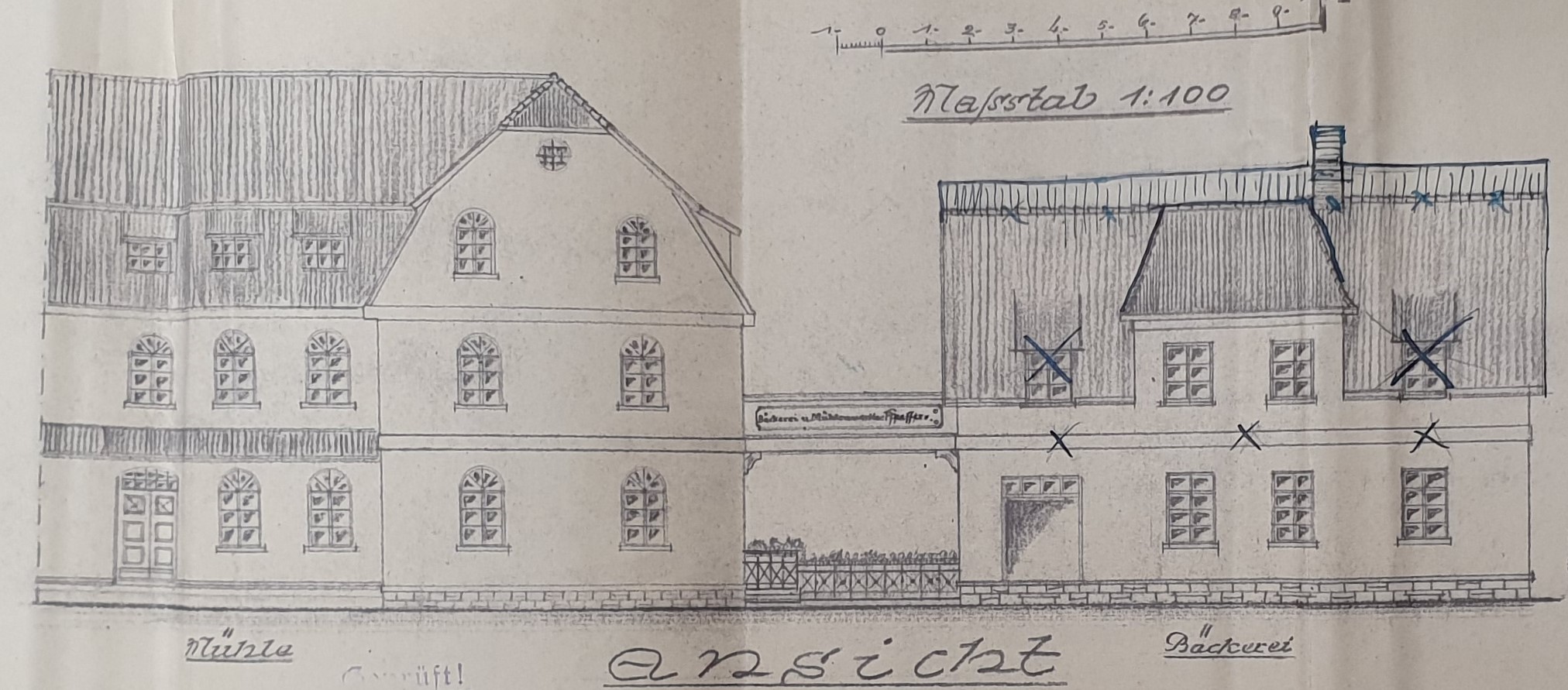 Die Mühle wurde von Carl Pfeiffer erbau und ging 1912 in Betrieb. Sie wurde mit Dieselmotoren betrieben. 1928 baute Carl rechts daneben eine Bäckerei. Dort gab es auch einen Verkaufsraum, aber er lieferte auch das Brot nach Kassel.