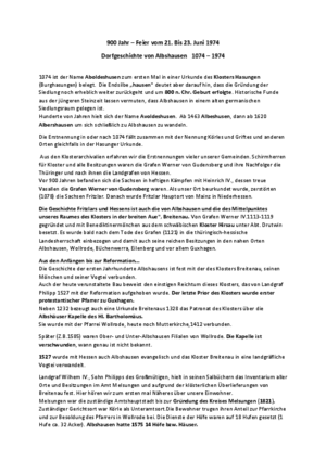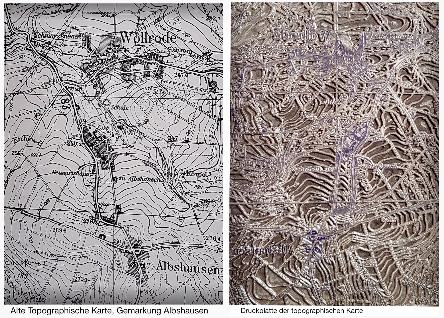 Dorfgeschichte Albshausen aus Festschrift zu 900 Jahre Albshausen und ein Foto der Dorfkarte und der Originaldruckplatte