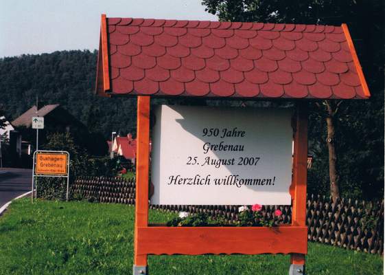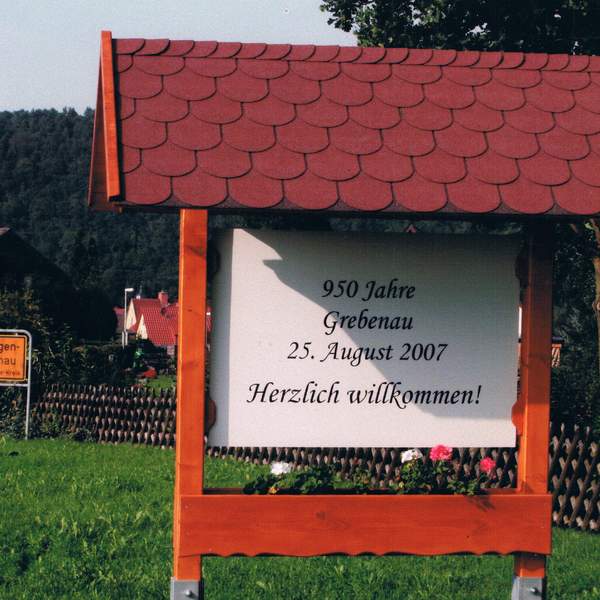 Bild von 2007, Tafel am Ortseingang von Grebenau zur 950 Jahrfeier