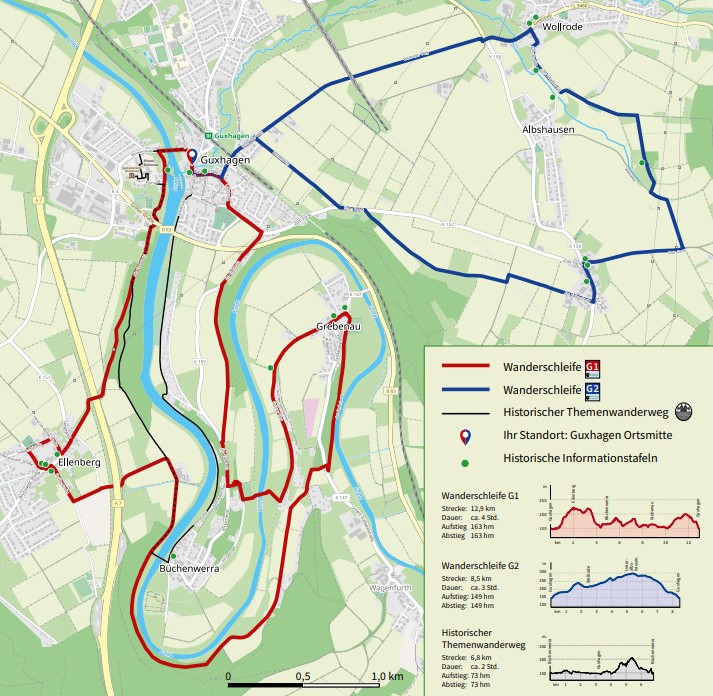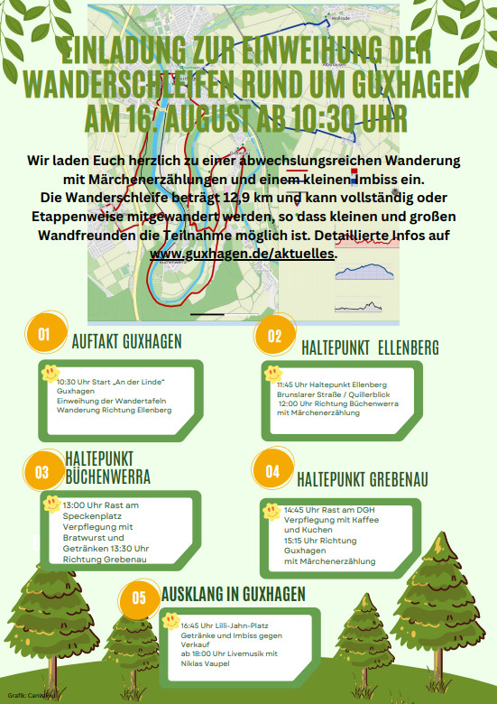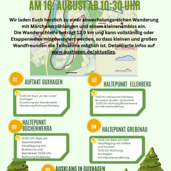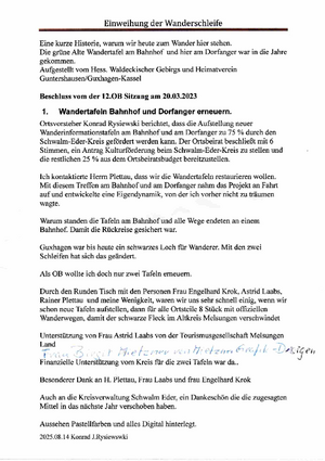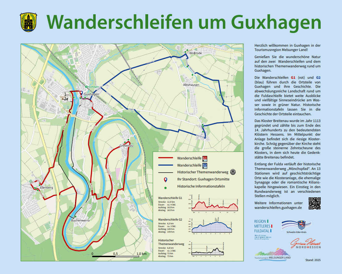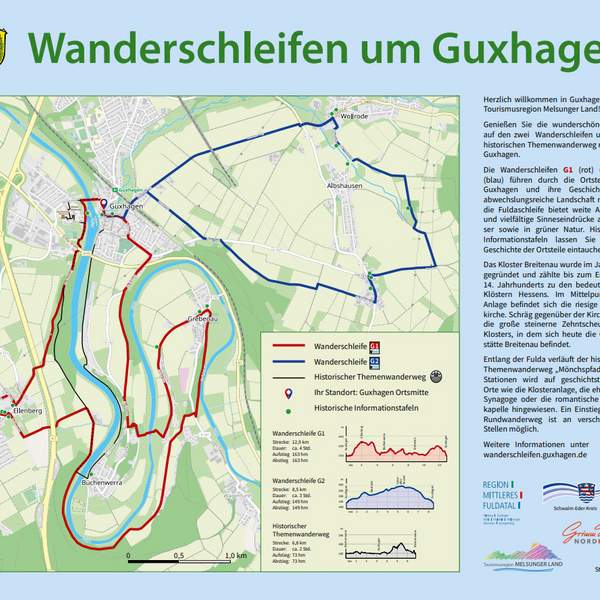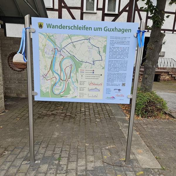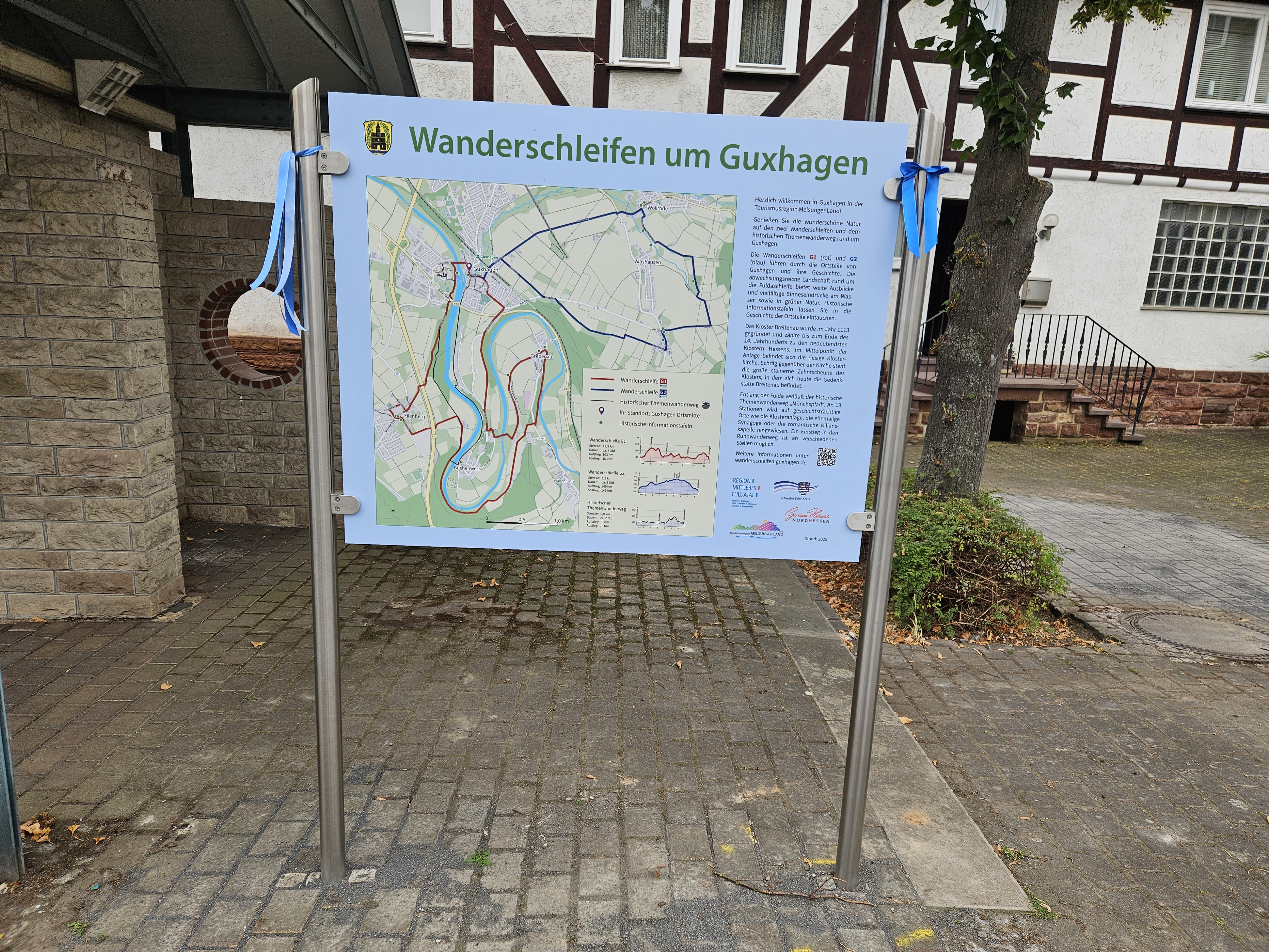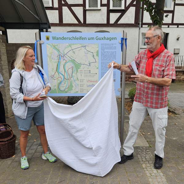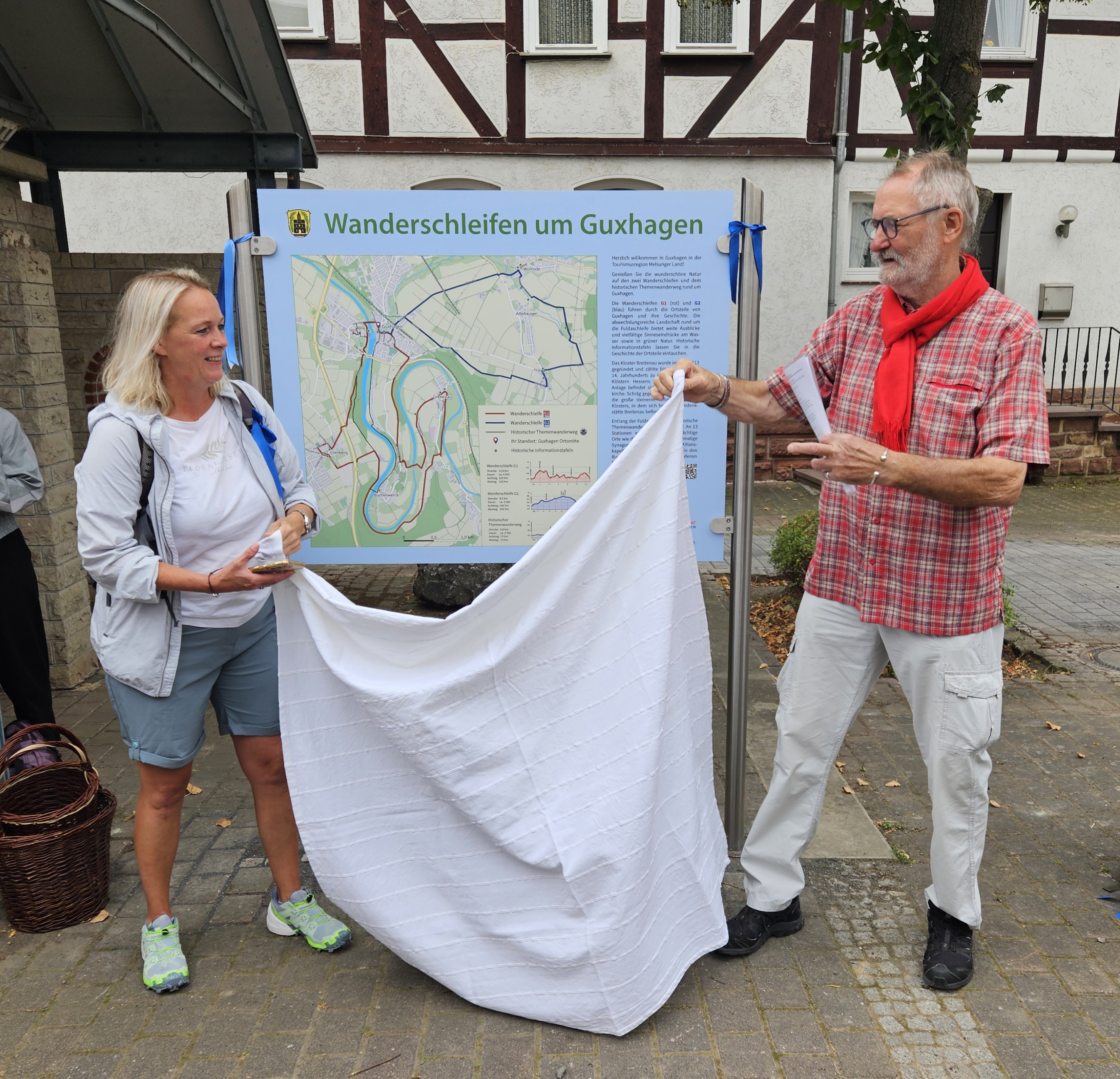 Anlässlich der Einweihung der zwei neuen Wanderwege durch und um Guxhagen wurde am 16.08.2025 von der Bürgermeisterin Susanne Schneider und dem Ortsvorsteher Konrad Rysiewski eine von 8 neuen Wandertafeln von Guxhagen enthüllt.
