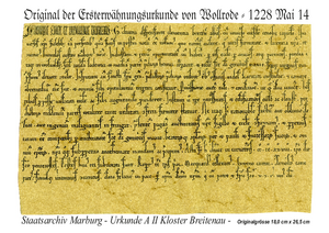 Texte und Objekte: Die Ersterwähnungsurkunde von Wollrode datiert vom 4. Mai 1228 - Pfingstsonntag. Da zu dieser Zeit das Pfingstfest nur an einem Tage gefeiert wurde, konnte die Datierung auf einen Tag genau festgelegt werden. Durch meine Tätigkeit als Städteplaner wurden mir auch die Überwachung der Arbeiten für die Erschliessungsmassnahmen (Kanal-Wasser-Straßenbau) übertragen. Durch die Zusammenarbeit mit dem Ingenieurbüro Bier aus Marburg wurde mir zur Kenntnis gebracht, dass der Vater von Herrn Bier ein guter Bekannter des Archivdirektors des Staatsarchives in Marburg war, der sich sehr interessiert zeigte diese Urkunde zu übersetzen. Daraufhin habe ich Herrn Bier unsere Ersterwähnungsurkunde zur Übersetzung für Herrn Dr. Wilhelm Alfred Eckhardt übergeben, der diese dann in die lateinische Sprache übersetzt hat. WO1031