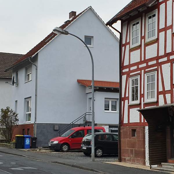 Das Foto mit den fünf Damen wurde 1960 vor den Häusern Brückenstraße 25 und 27, gegen über der Klostermauer aufgenommen. Im Vergleich die gleiche Ansicht 2022.