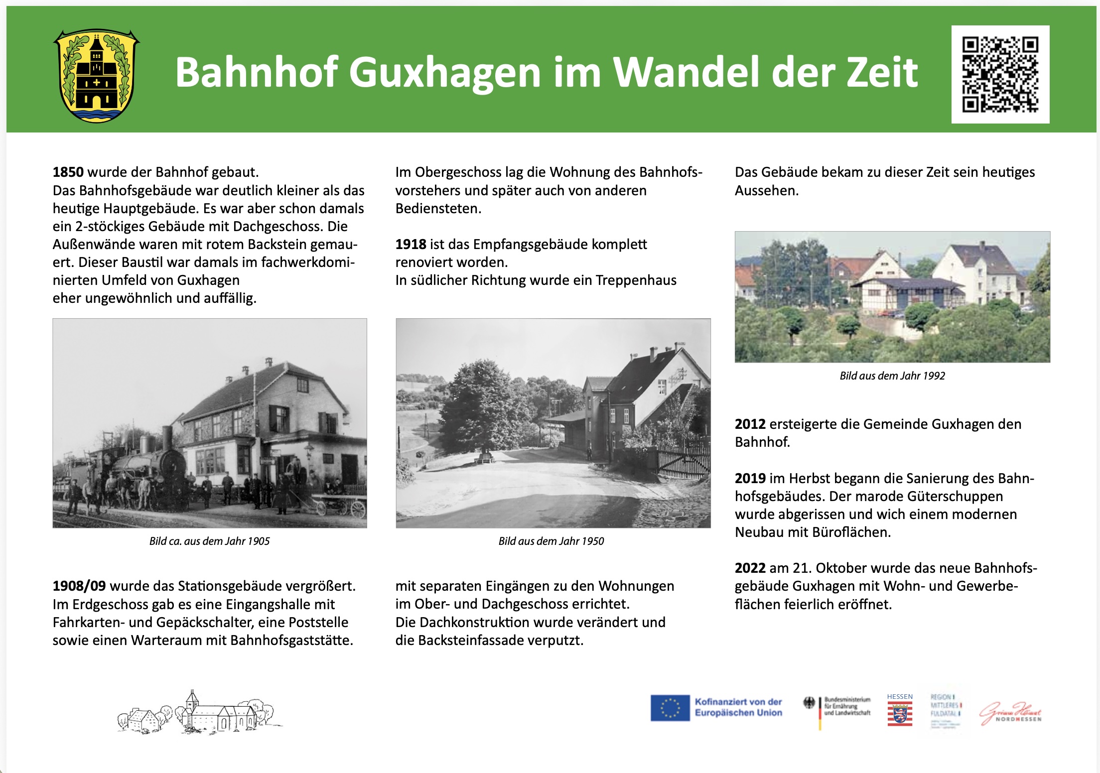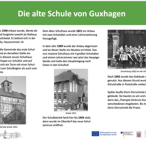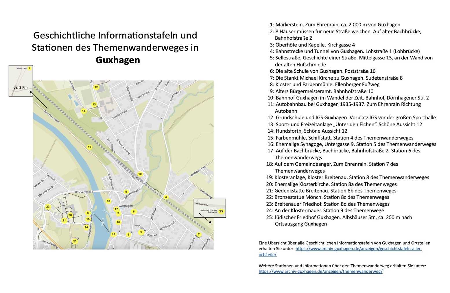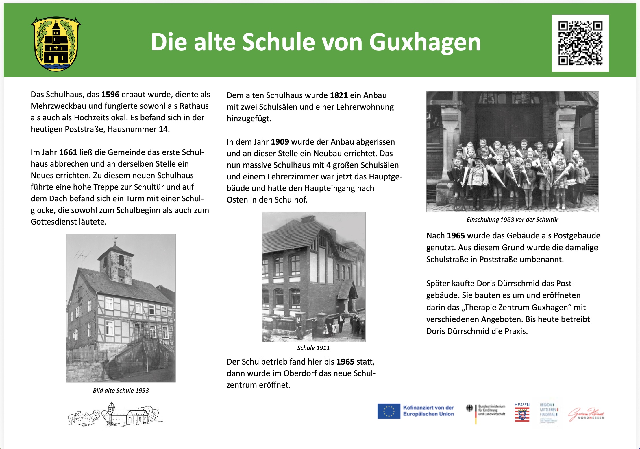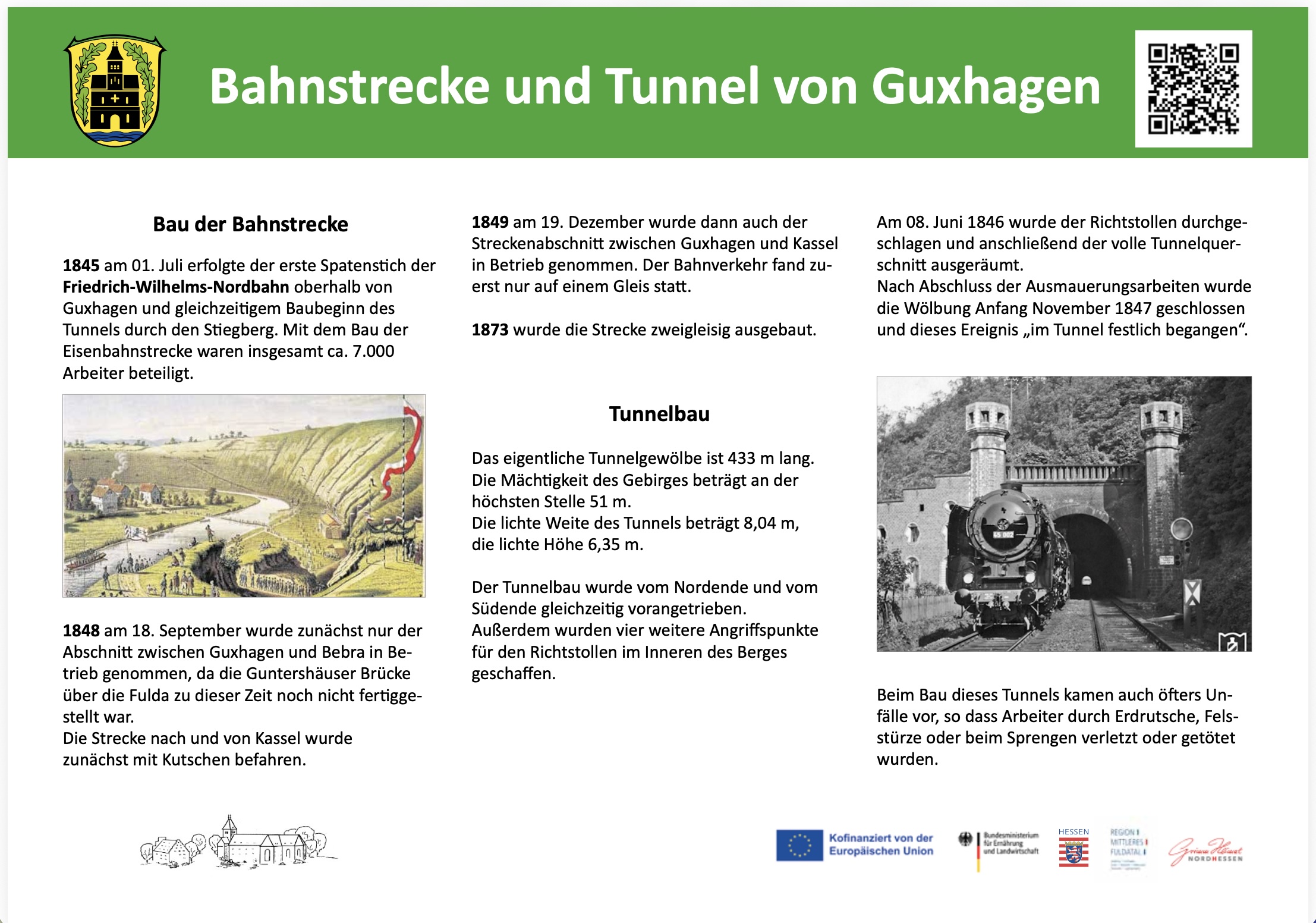 Die Gemeinde Guxhagen hat im Gemeindegebiet Geschichtliche Informationstafeln aufgestellt um die Geschichte, Traditionen, Brauchtum oder alte Handwerkskunst mit Foto und Beschreibung darzustellen. Sie sollen Regionalgeschichte, Hintergründe und Bedeutung von Orten verständlich erläutern, lokale Identität stärken und den Tourismus fördern.