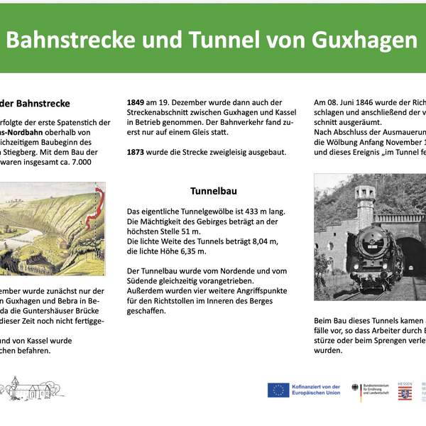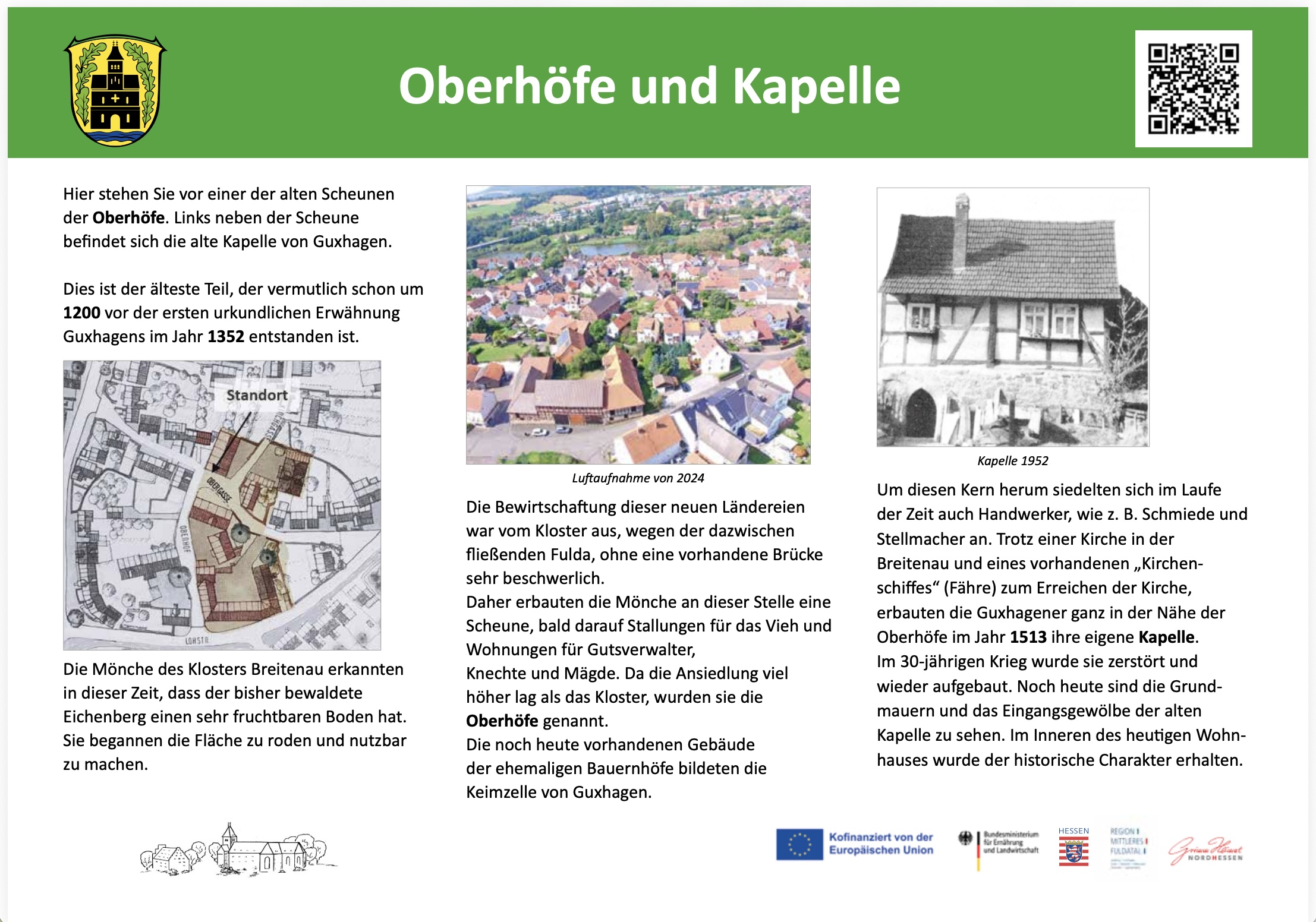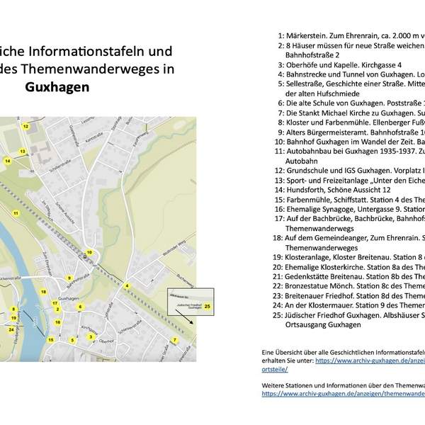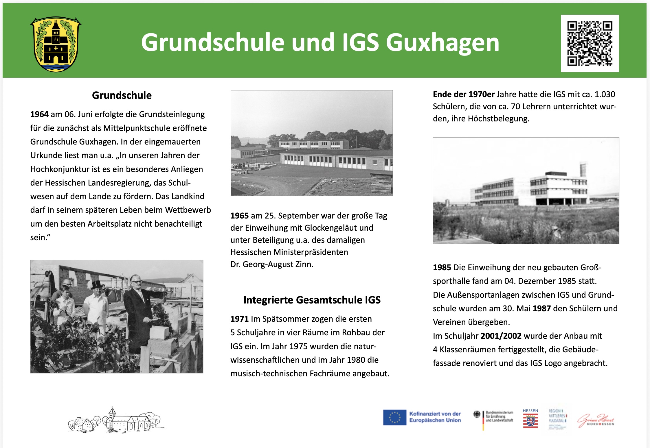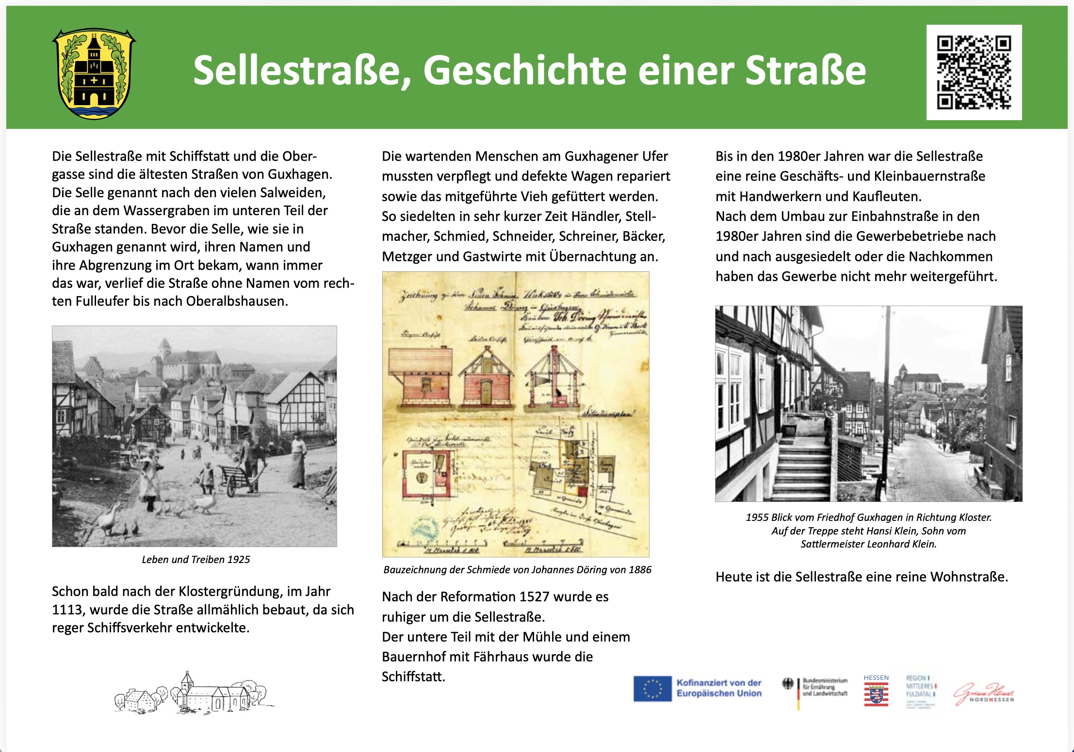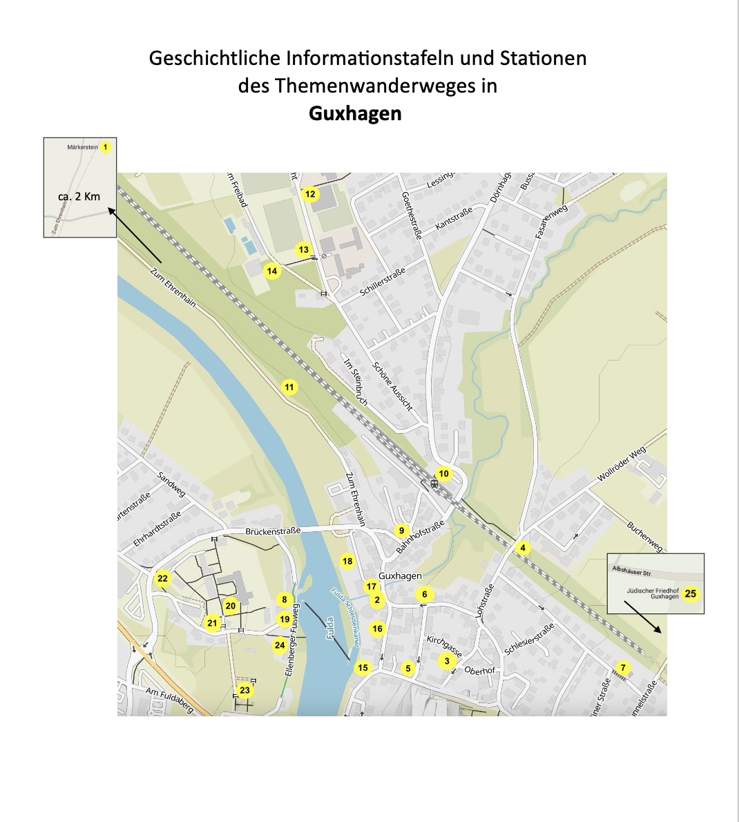 Die Gemeinde Guxhagen hat im Gemeindegebiet Geschichtliche Informationstafeln aufgestellt um die Geschichte, Traditionen, Brauchtum oder alte Handwerkskunst mit Foto und Beschreibung darzustellen. Sie sollen Regionalgeschichte, Hintergründe und Bedeutung von Orten verständlich erläutern, lokale Identität stärken und den Tourismus fördern.