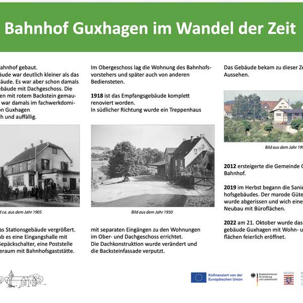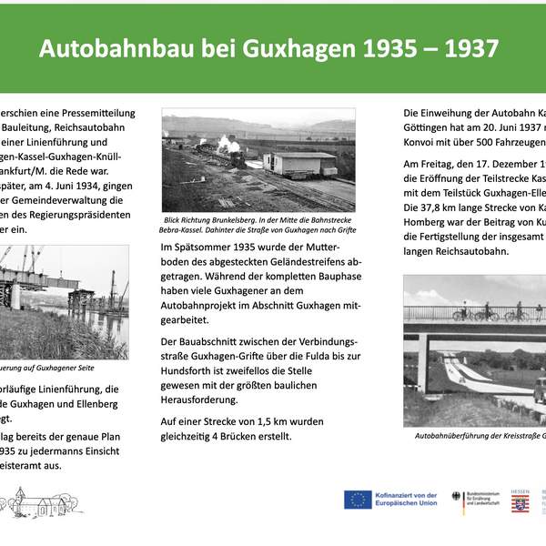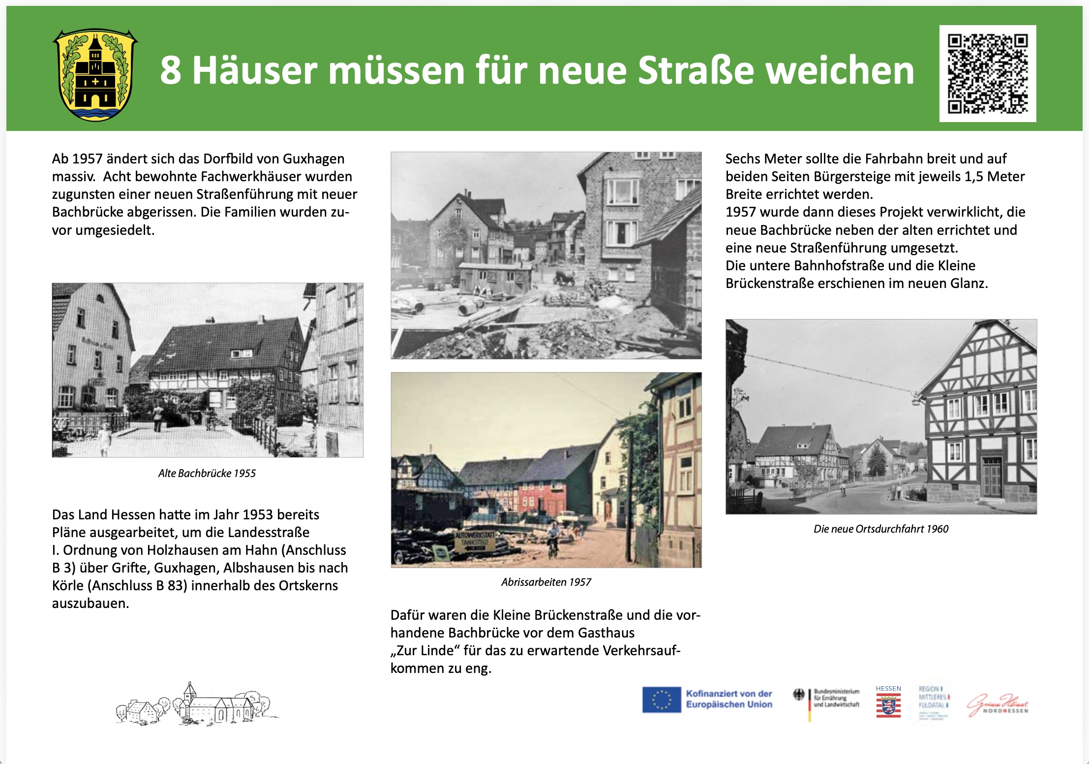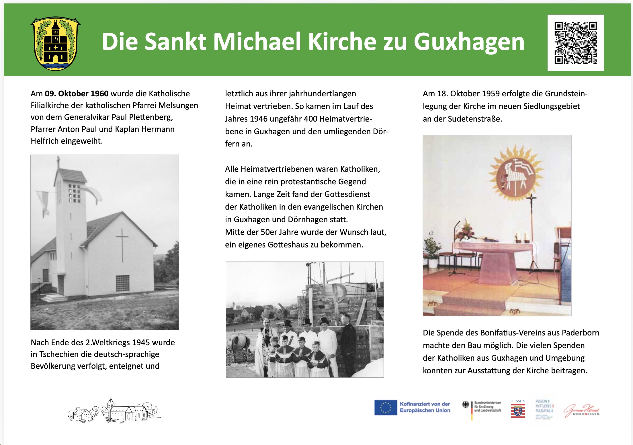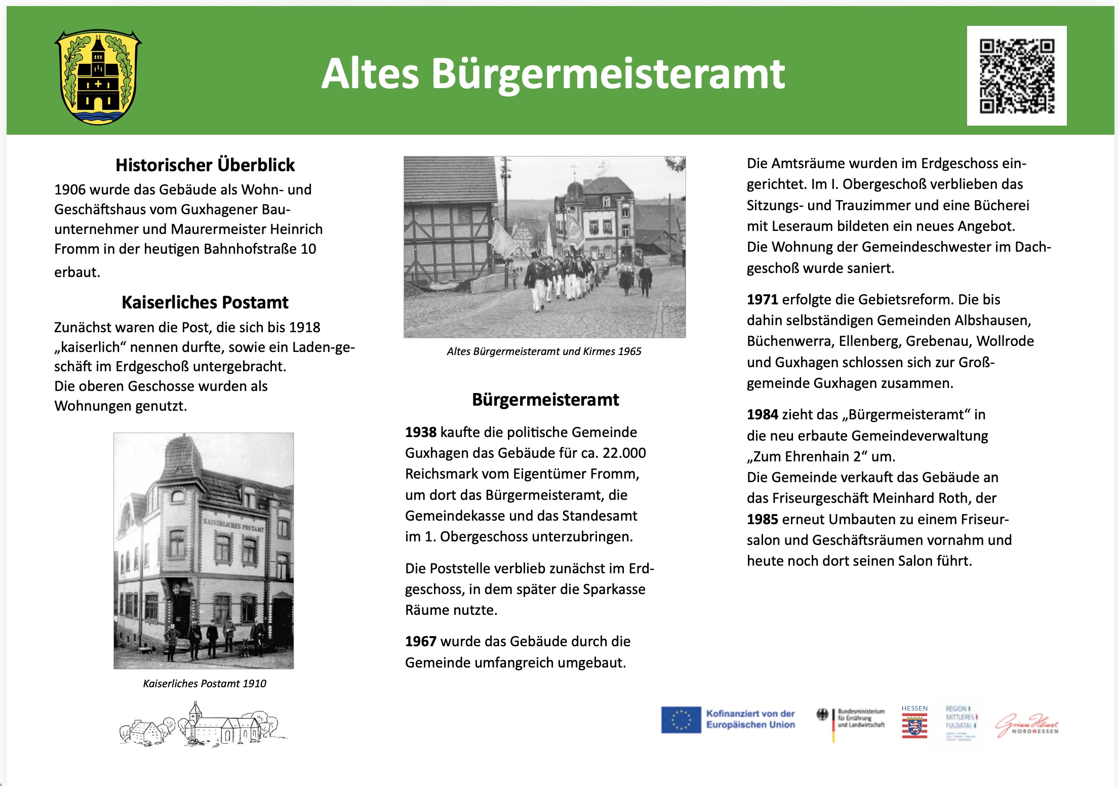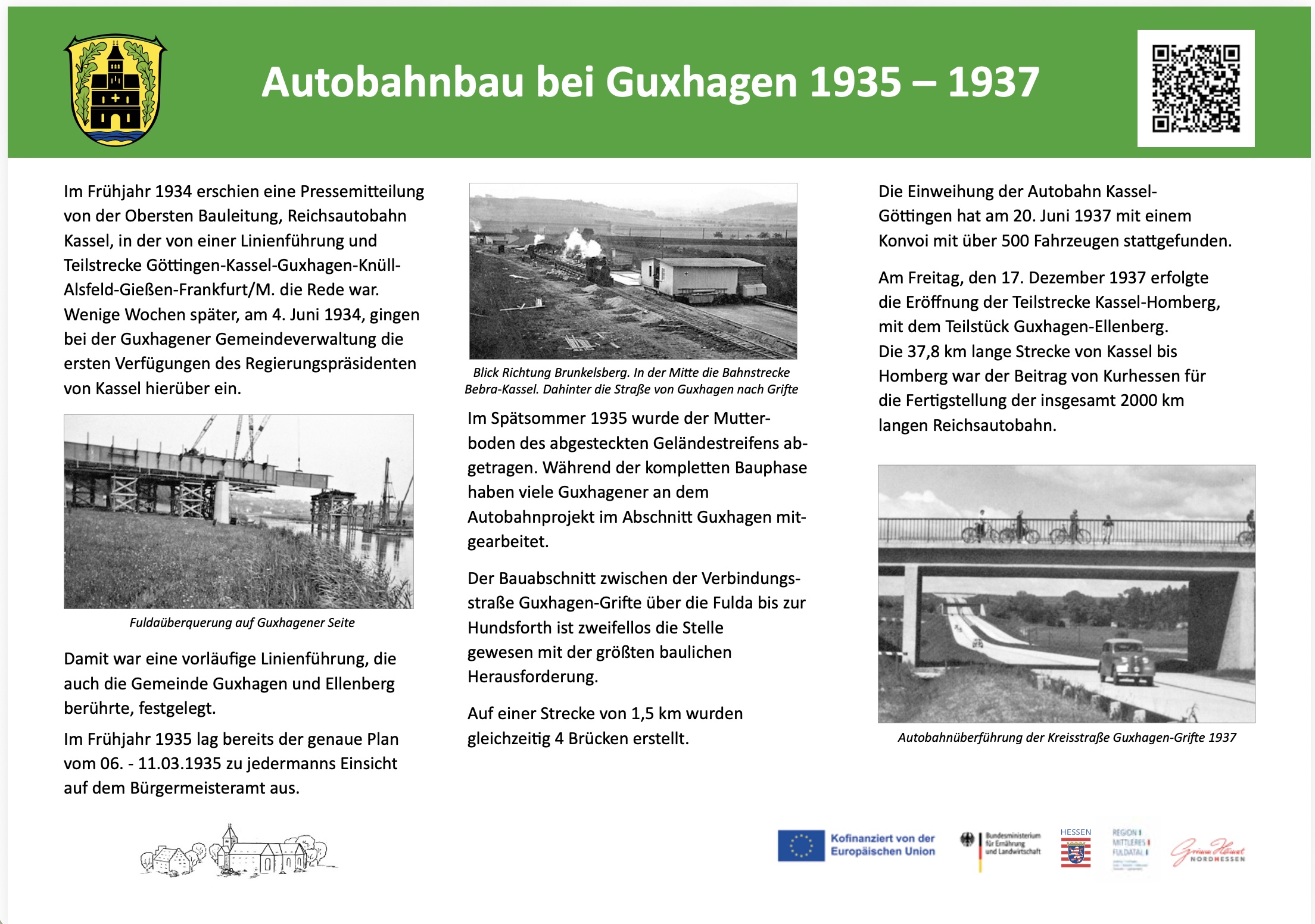 Die Gemeinde Guxhagen hat im Gemeindegebiet Geschichtliche Informationstafeln aufgestellt um die Geschichte, Traditionen, Brauchtum oder alte Handwerkskunst mit Foto und Beschreibung darzustellen. Sie sollen Regionalgeschichte, Hintergründe und Bedeutung von Orten verständlich erläutern, lokale Identität stärken und den Tourismus fördern.