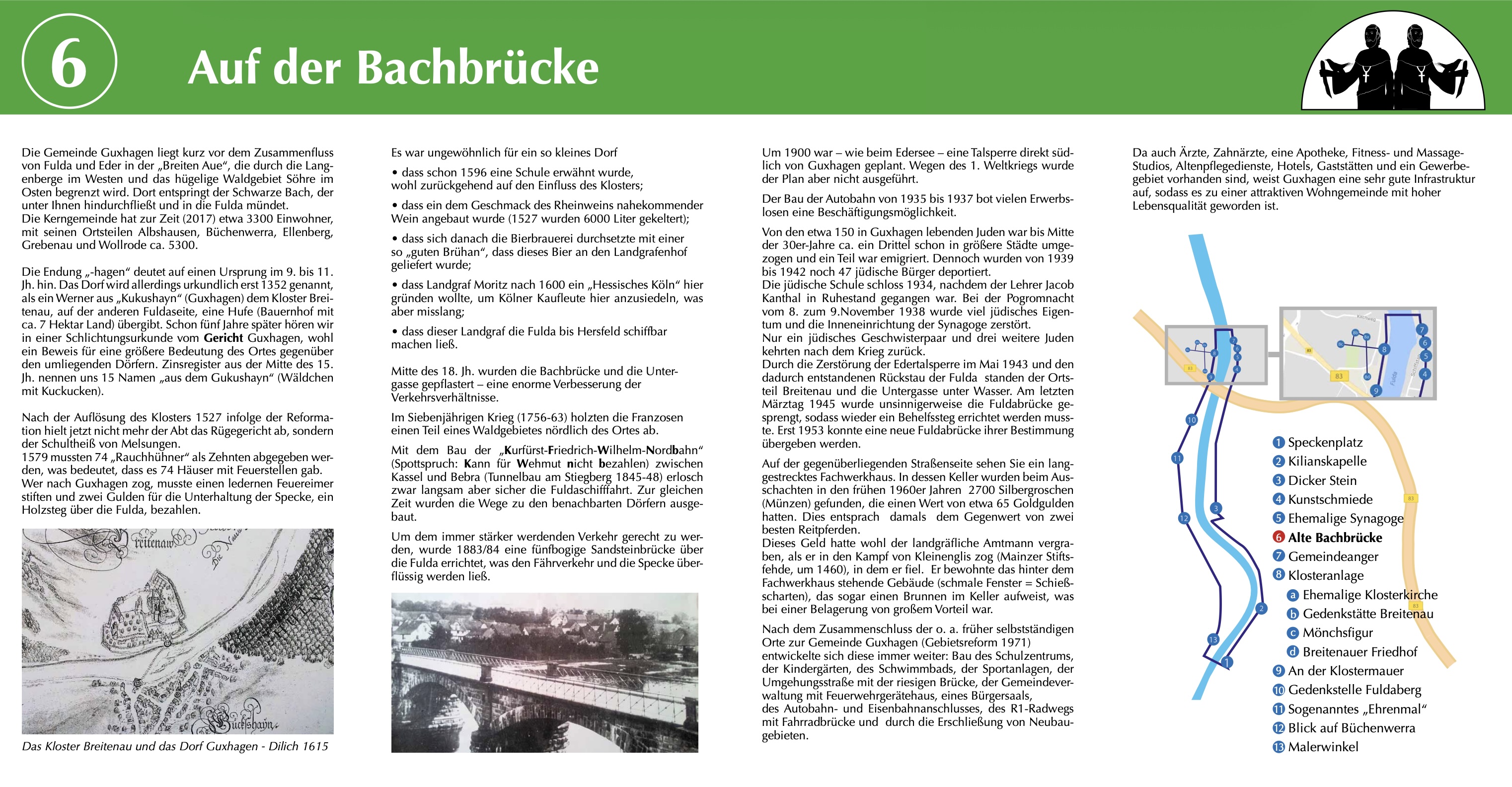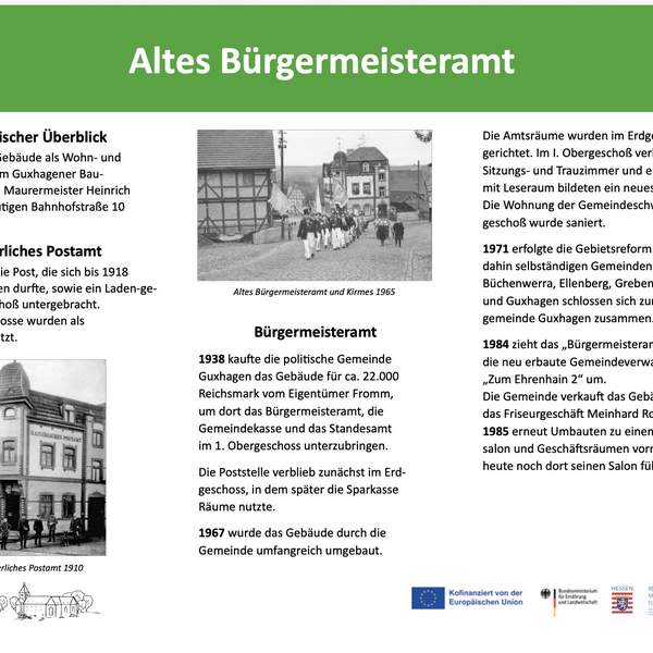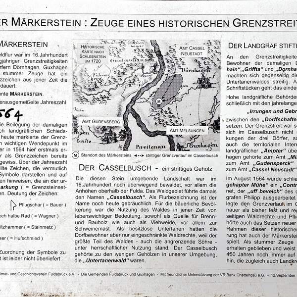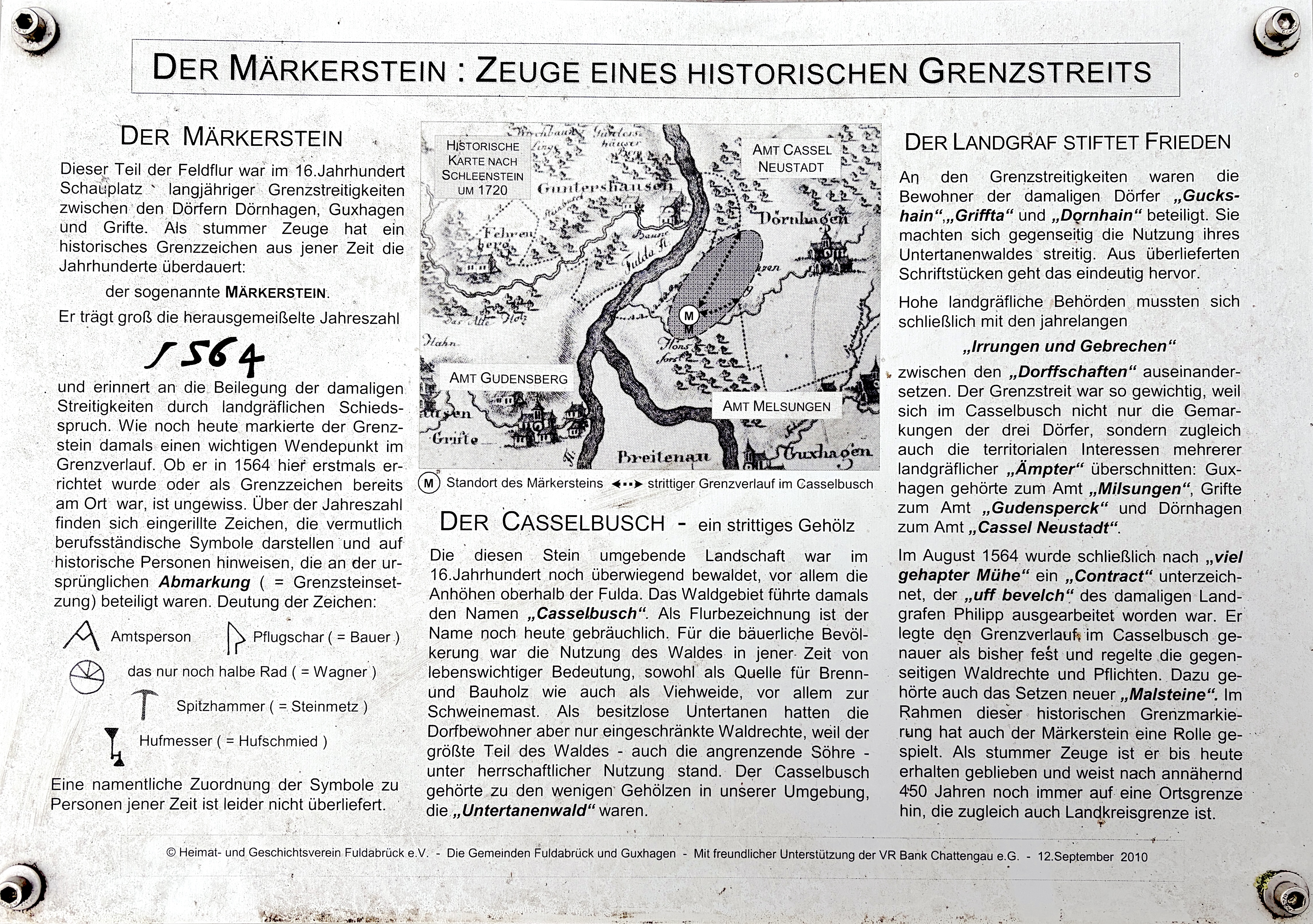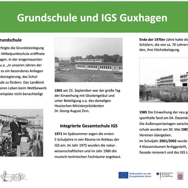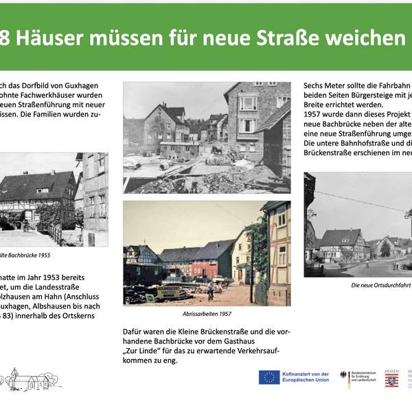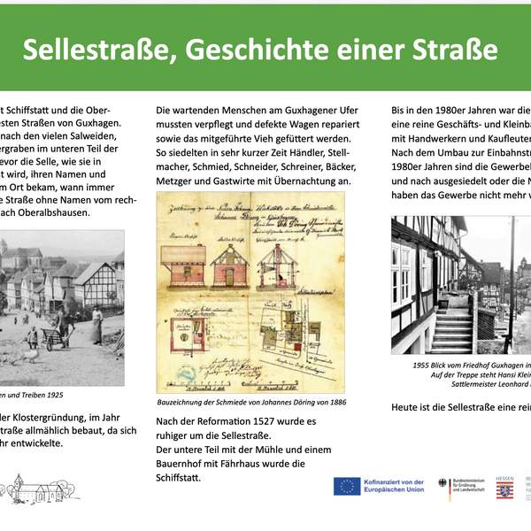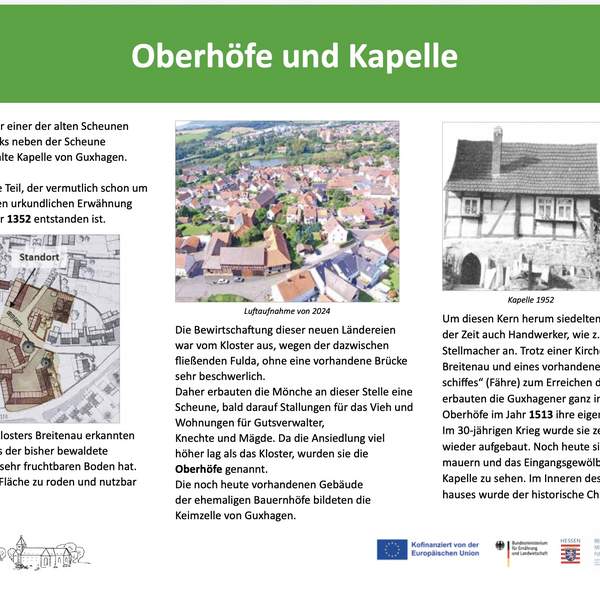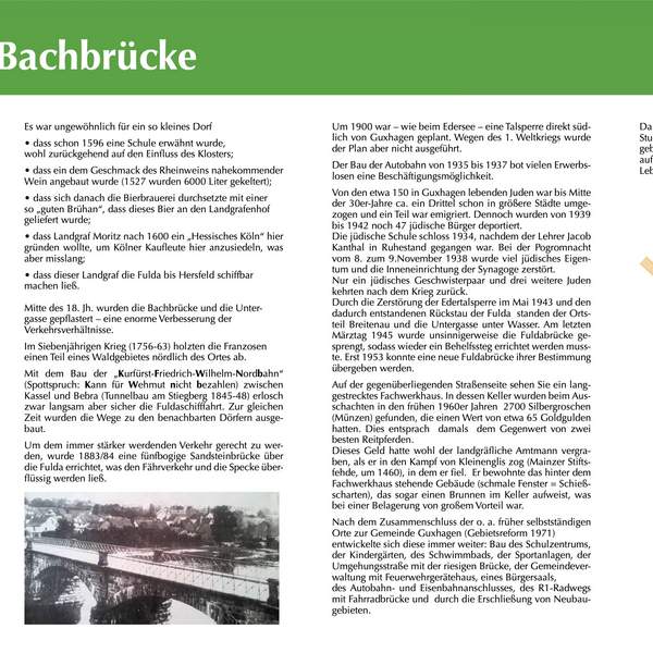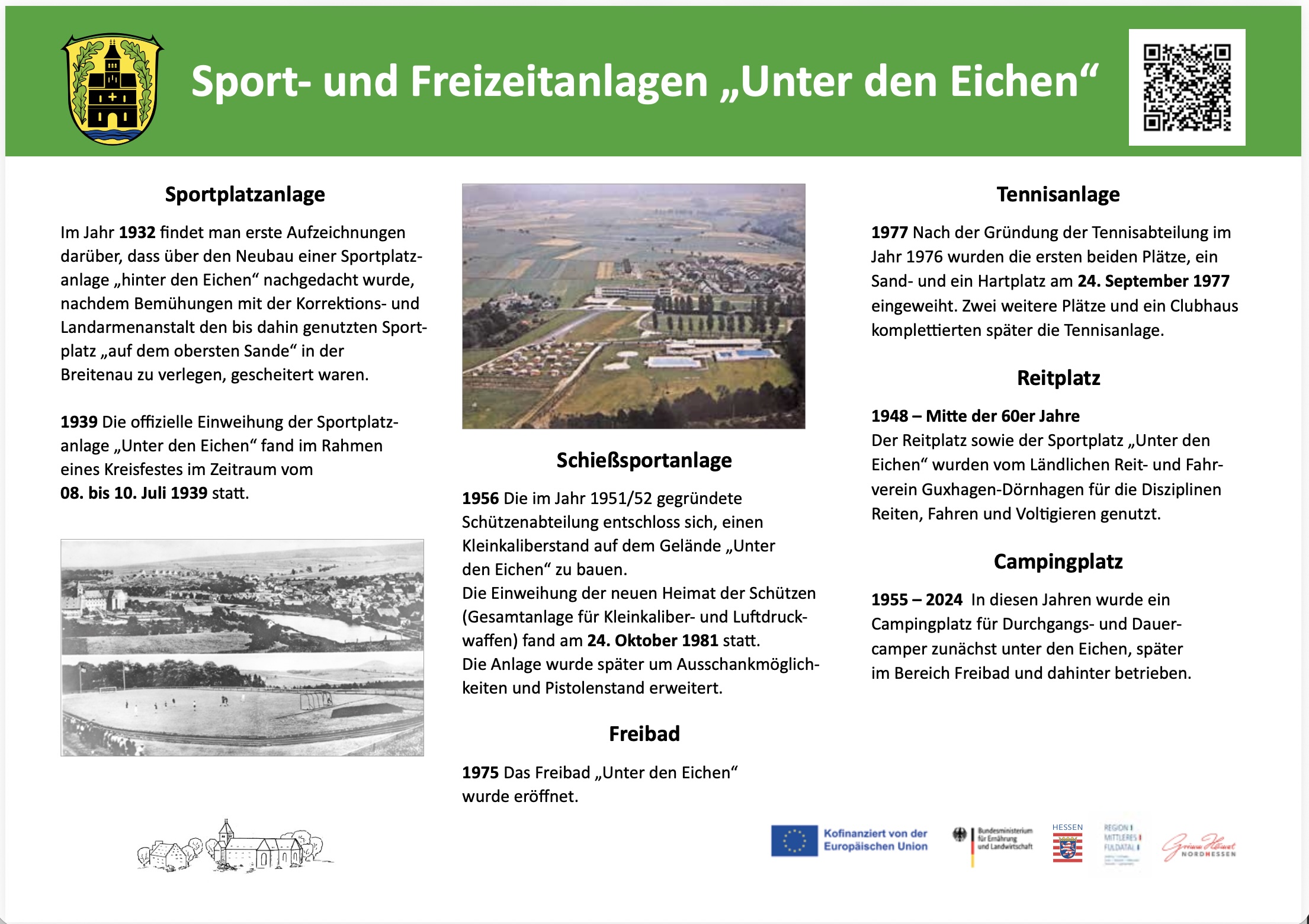 Die Gemeinde Guxhagen hat im Gemeindegebiet Geschichtliche Informationstafeln aufgestellt um die Geschichte, Traditionen, Brauchtum oder alte Handwerkskunst mit Foto und Beschreibung darzustellen. Sie sollen Regionalgeschichte, Hintergründe und Bedeutung von Orten verständlich erläutern, lokale Identität stärken und den Tourismus fördern.
