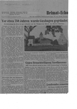 Zum ersten Mal wurde Guxhagen in einer Urkunde erwaehnt, in der ein Bauer dem Kloster Breitenau 1352 eine "Hufe Landes" als Stiftung übereignet hat.