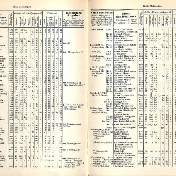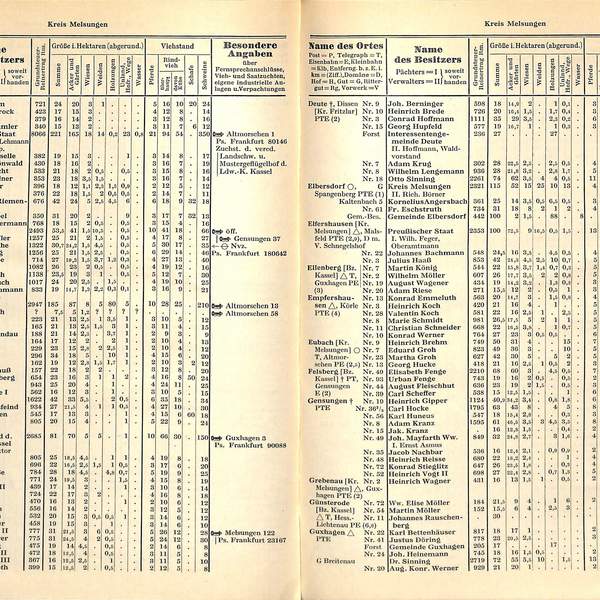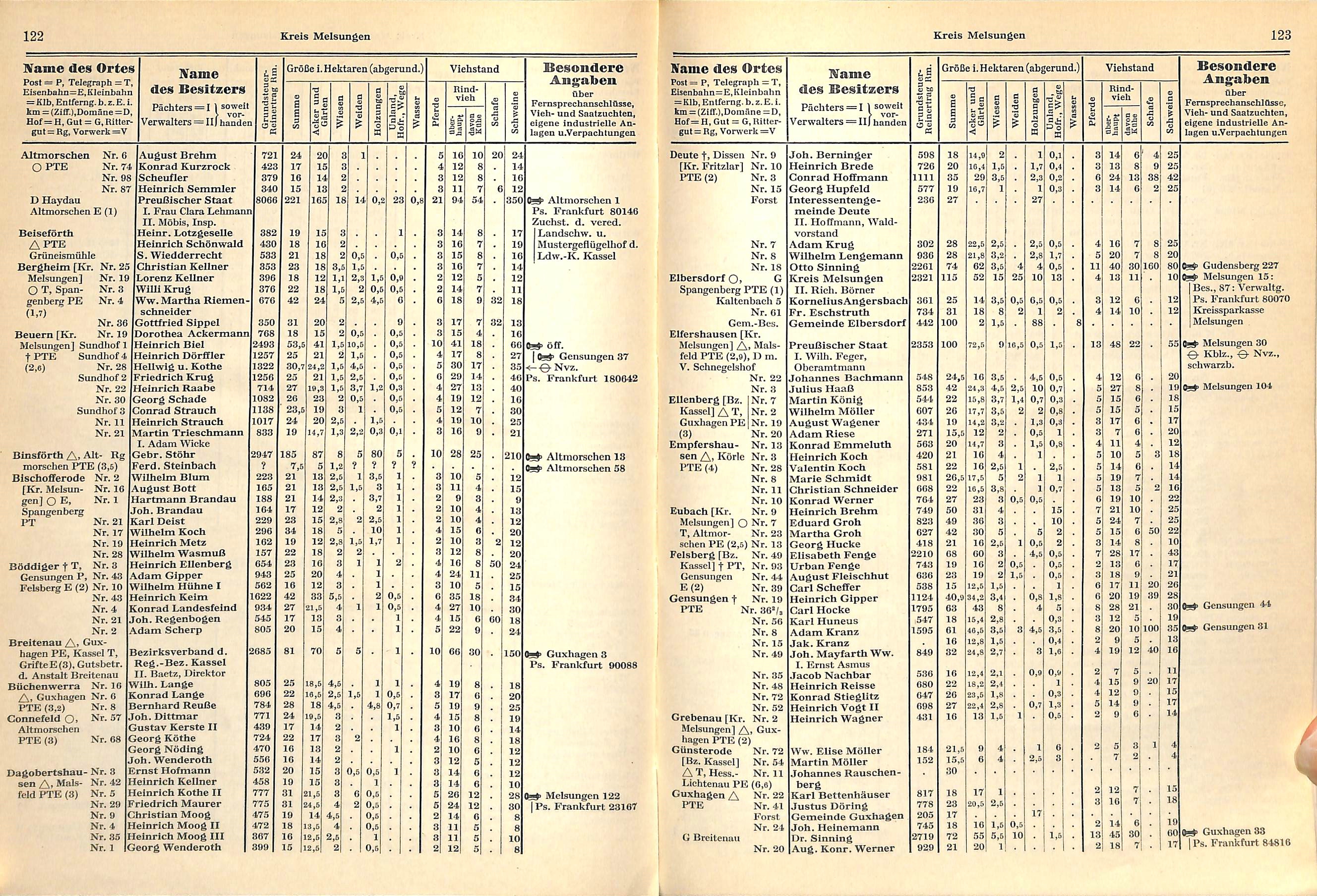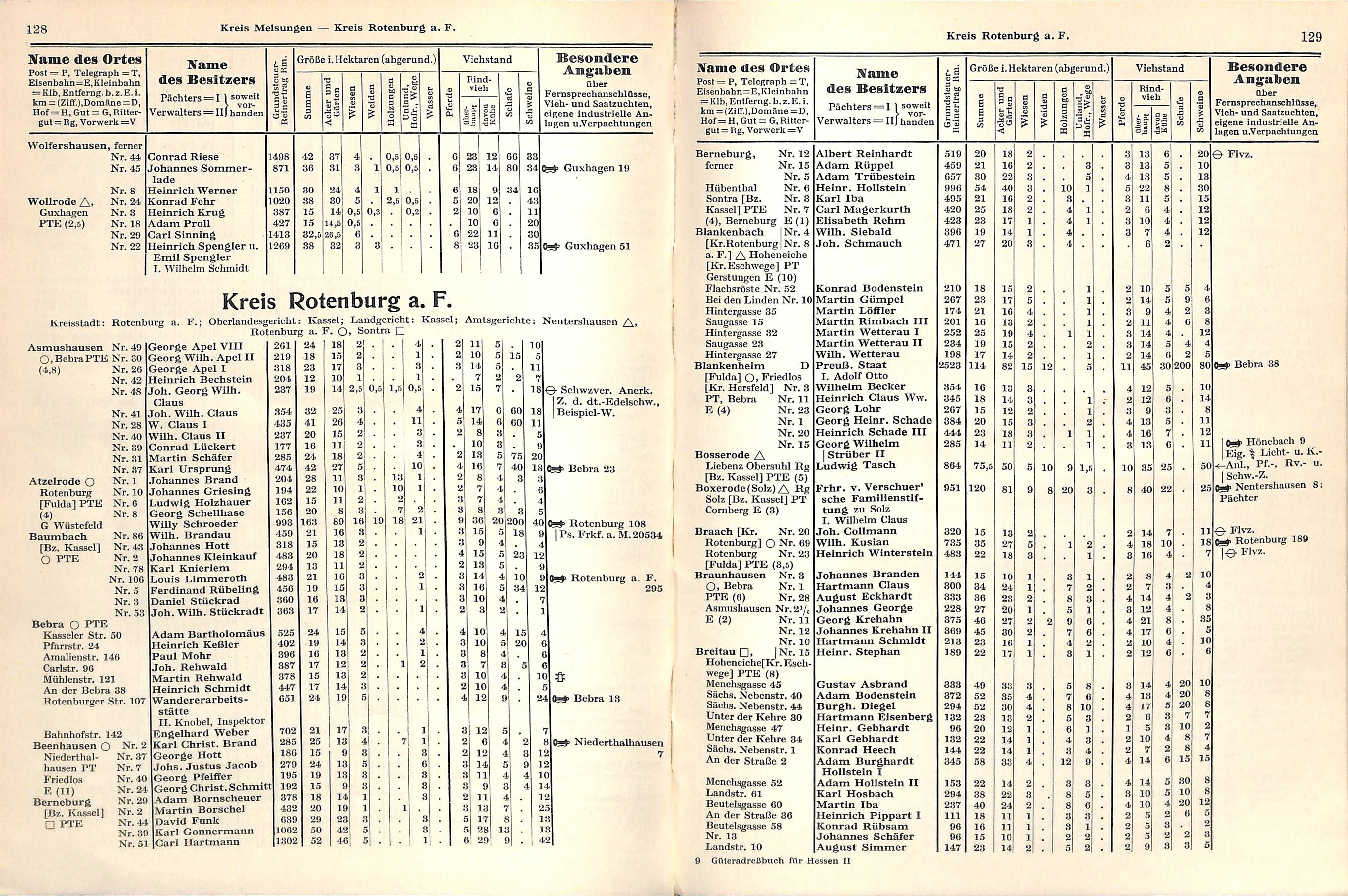 In den Niekammer's Landwirschaflichen Güter-Adressbüchern wurde jedes Jahr für ganz Deutschland alle Kennzahlen für alle grössern Höfe aufgeführt. Ortsname, Hausnummer, Name des Besitzers, Grundsteuer Betrag, größe des Hof in Hektar,und Viehbestand