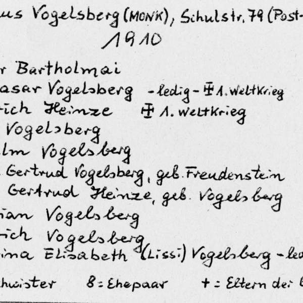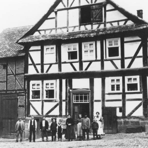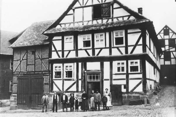 Vor dem Haus stehen v.l.n.r. Herr Bartholmai, Baltasar Vogelsberg, Heinrich Heinze, Jacob Vogelsberg, Abba Gertrud Vogelsberg, geb. Freudenstein, Anna Gertrud Heinze, geb. Vogelsberg, Christian Vogelsberg, Heinrich Vogelsberg und Katharina Elisabeth (Lissi) Vogelsberg