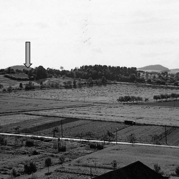 Das Bild zeigt das Haus Hubert mit Baumschule am Hubertswäldchen. Der kleine Wald erstreckt sich auch noch auf der anderen Seite der Autobahn zum Brunkelsberg.