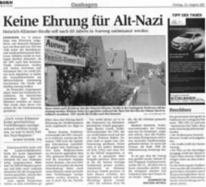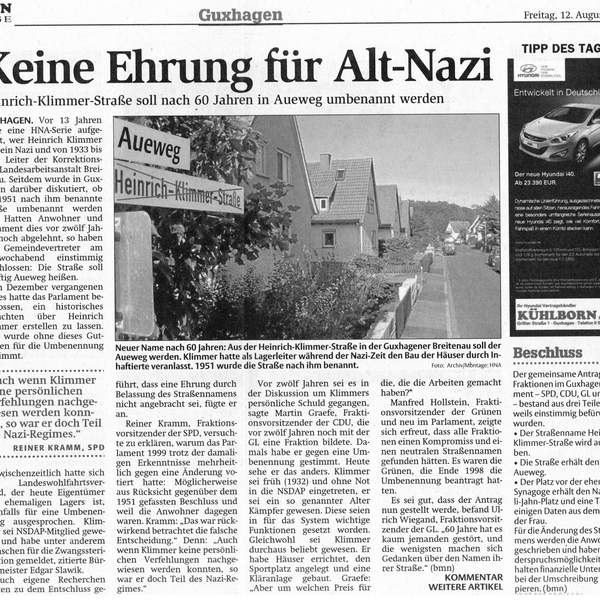Vor 13 Jahren hatte eine HNA-Serie aufgedeckt, wer Heinrich Klimmer war: ein Nazi und von 1933 bis 1940 Leiter der Korrektions- und Landesarbeitsanstalt Breitenau. Seitdem wurde in Guxhagen darüber diskutiert, ob die 1951 nach ihm benannte Straße umbenannt werden soll. Hatten Anwohner und Parlament dies vor zwölf Jahren noch abgelehnt, so haben die Gemeindevertreter am Mittwochabend einstimmig beschlossen: Die Straße soll künftig Auewegheißen.