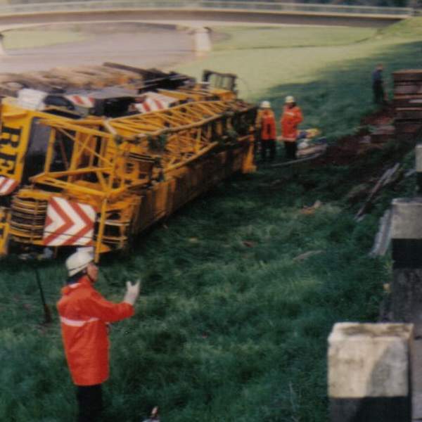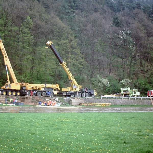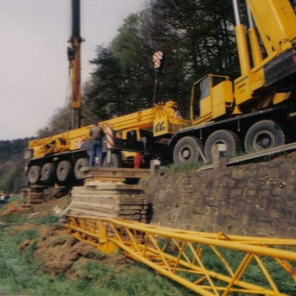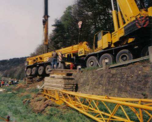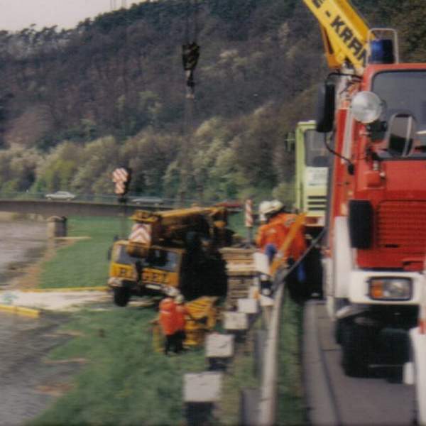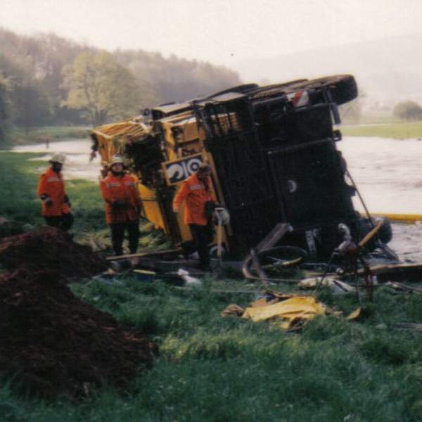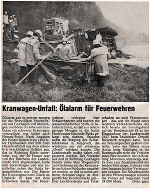 Am Morgen des 24.04.1989 kam ein 60 Tonnen schwerer auf der L 3221, auf der Fahrt von Guxhagen nach Körle, nach rechts von der Fahrbahn ab. Der Fahrer musste einem entgegenkommenden Fahrzeug ausweichen, geriet auf die weiche Bankette, stürzte etwa 3m tief eine Böschung hinab, überschlug sich und blieb unmittelbar neben der leicht Hochwasser führenden Fulda, in Höhe Grebenau, auf der Seite liegen.