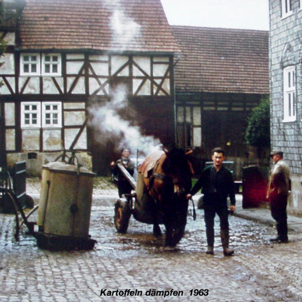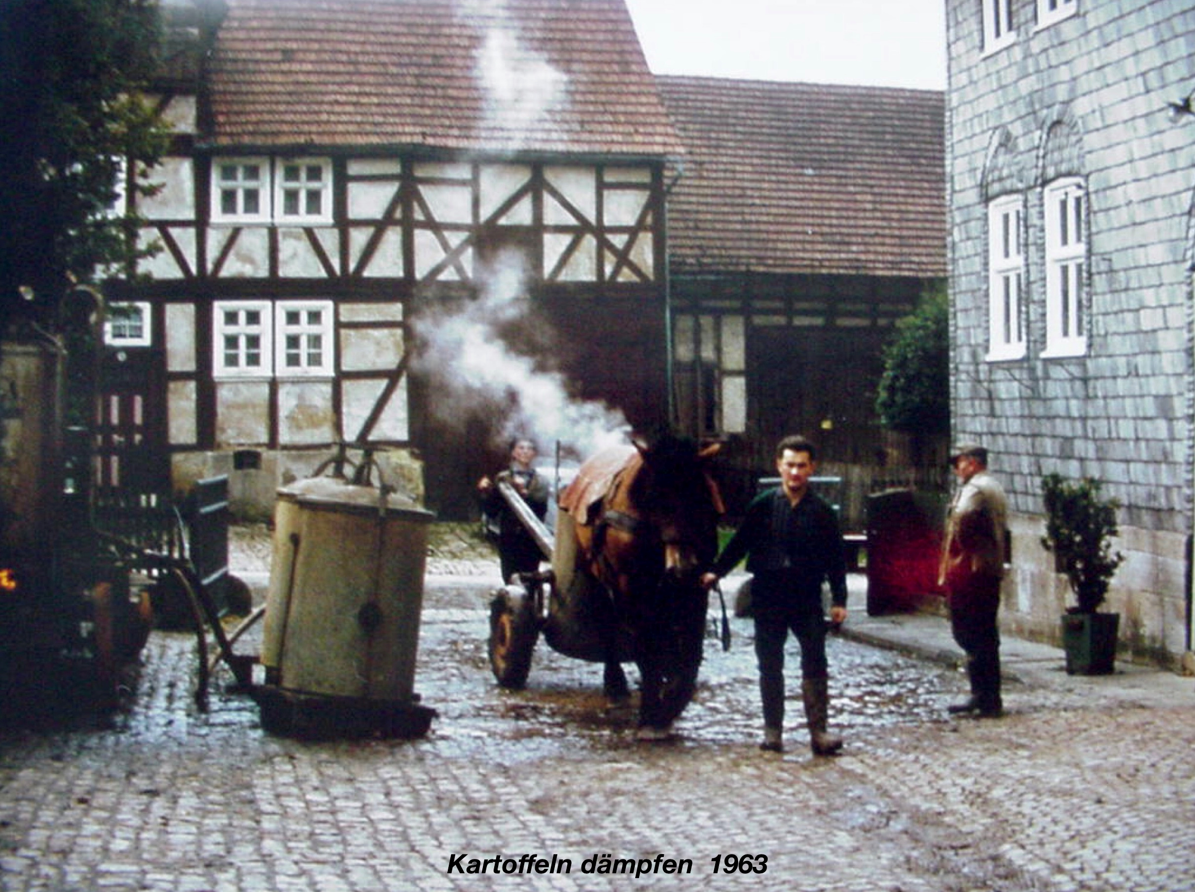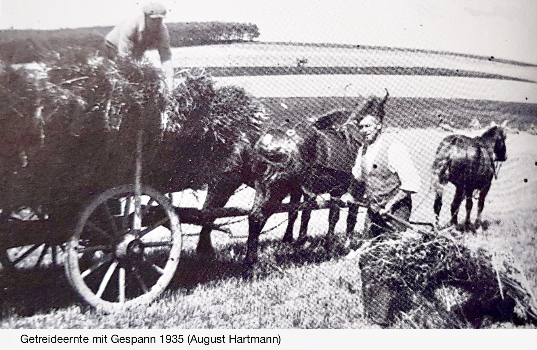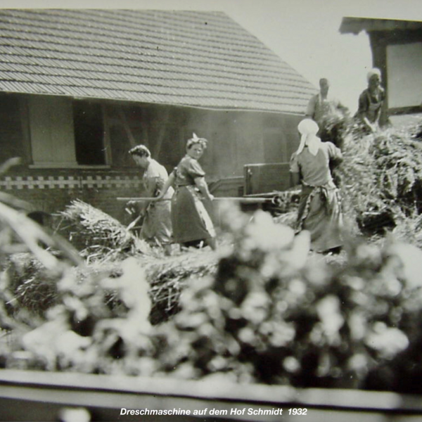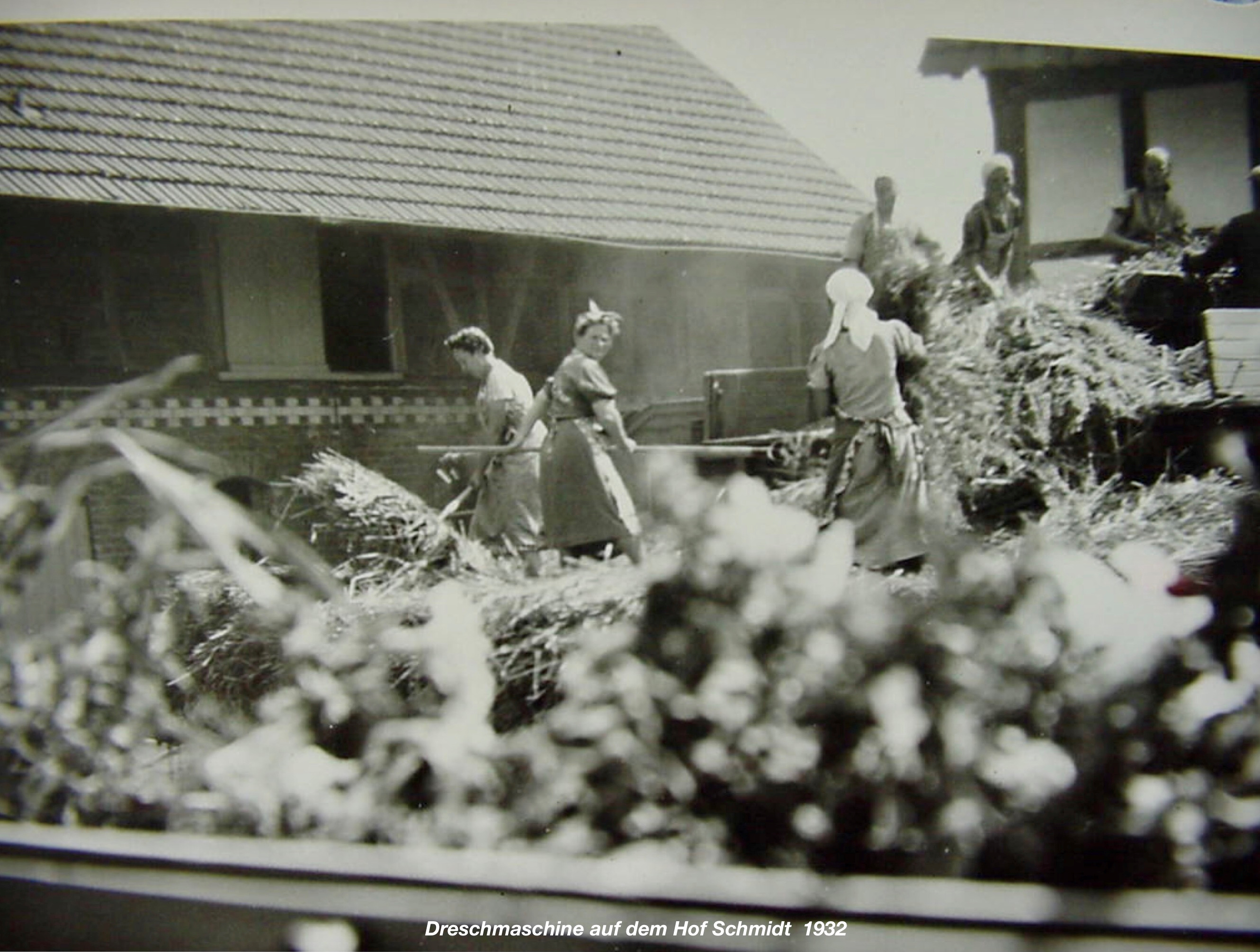 Nach dem Trocknen wurden die Garben mit Pferdefuhrwerk, teilweise schon mit Traktor, in die Scheunen transportiert. Zur weiteren Verarbeitung kam dann die Dreschmaschine (in 1952 schon mit Elektroantrieb) zum Einsatz. Viele Helfer waren nun nötig. Verladen der Garben aus der Scheune, auf die Dreschmaschine reichen, Garben auseinanderschneiden und in die Maschine einführen.