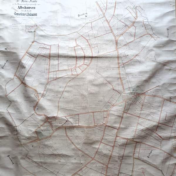 Die alten Zeichnungen entstanden um 1880, es handelt sich um handgezeichnete farbige Flurkarten, sogenannte Reinkarten des kompletten Gemeindegebiets. Grundlage der Zeichnungen waren die Rezesse in denen festgehalten wurde, wer der Besitzer der Grundstücke war.