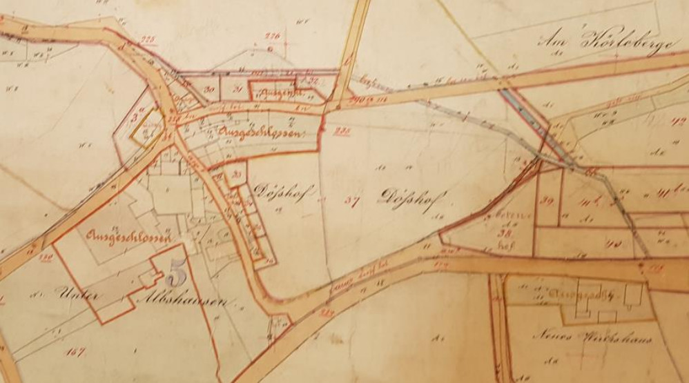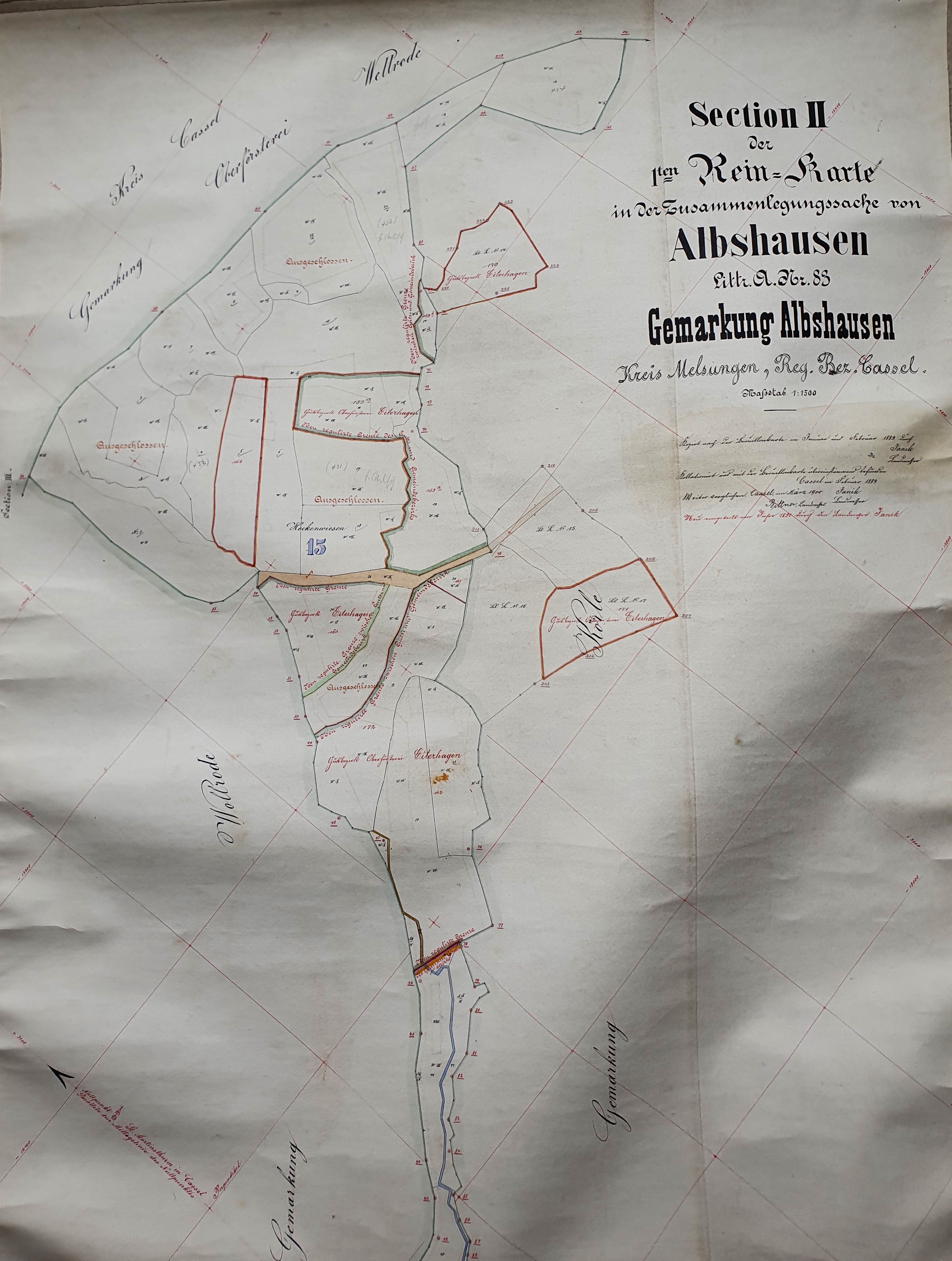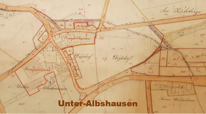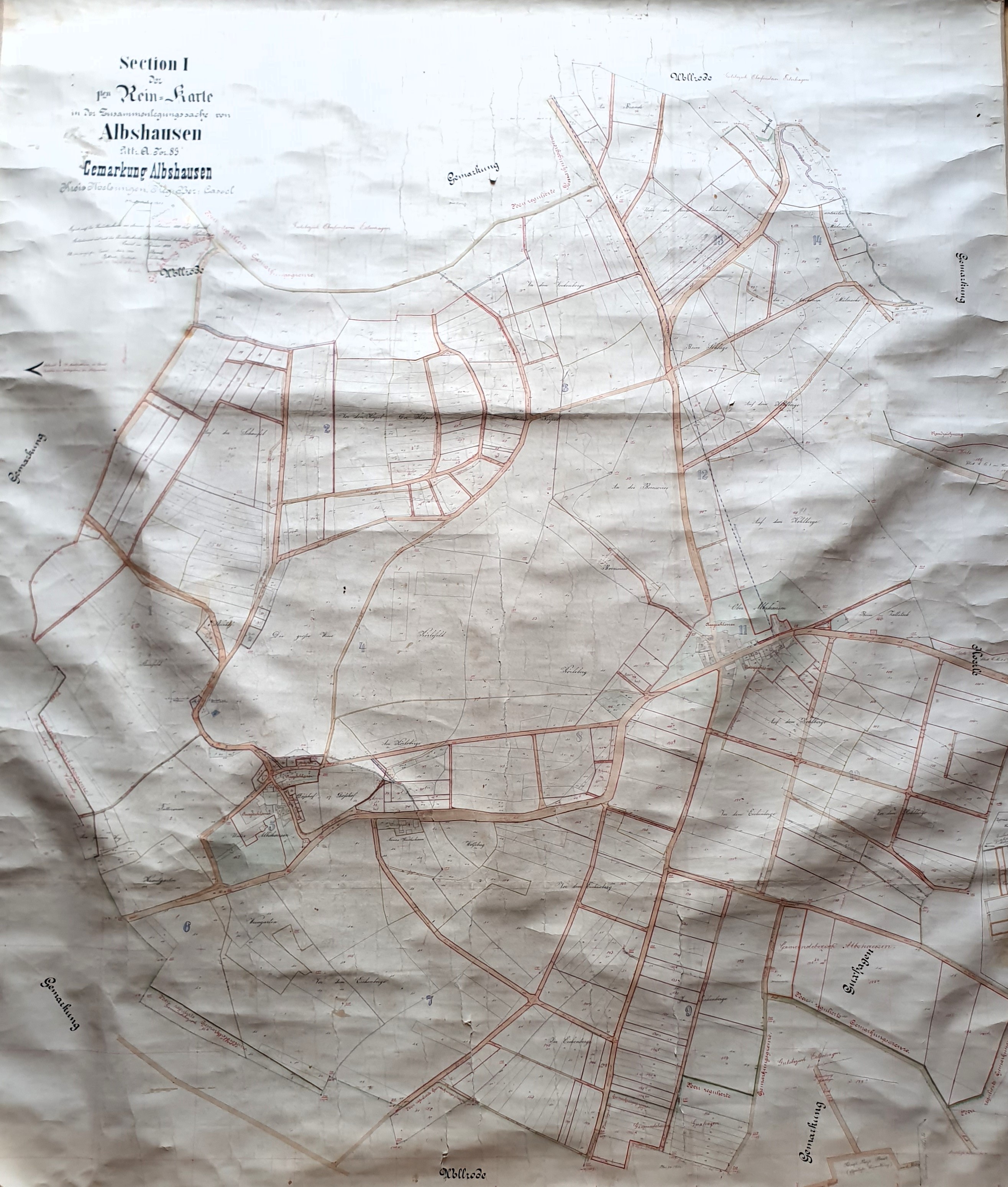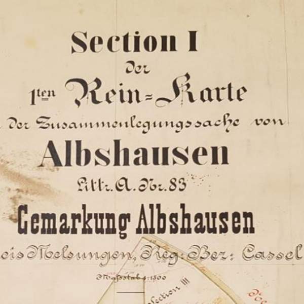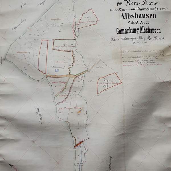 Ausschnitt aus der 1. Rein-Karte zur Zusammenlegung von Ober- und Unter-Albshausen sowie Abschluss der Flurbereinigung (Verkopplung)