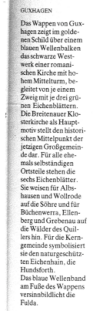 Das Wappen wurde zur Gründung der Großgemeinde Guxhagen 1971 von dem Grafiker Karl Nägel entworfen und beschrieben